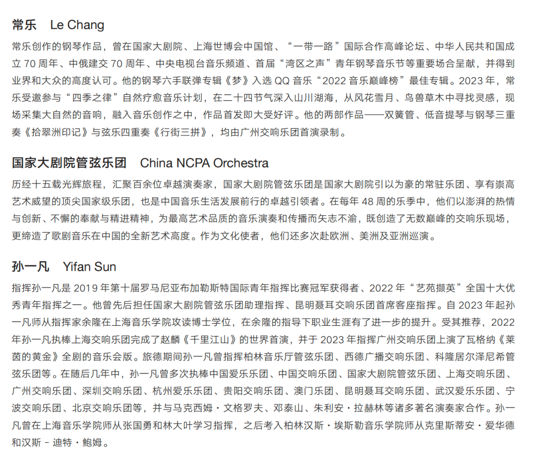 2024年第二季度开始,国家大剧院音乐厂牌NCPA Classics正式开启“大剧院现场”(NCPA Live)全新EP(迷你专辑)系列的策划与发布,甄选国家大剧院令人难忘的音乐演出现场录音,让演出亲历者有机会重温和收藏音乐记忆的同时,也希望能把更多人“带进”国家大剧院的精彩演出现场。NCPA Classics“大剧院现场NCPA Live”EP专辑皆选自近年来颇具乐迷口碑的大剧院音乐厅和小剧场演出现场,以CD实体唱片和数字上线的形式同时发布,欢迎大家持续关注。