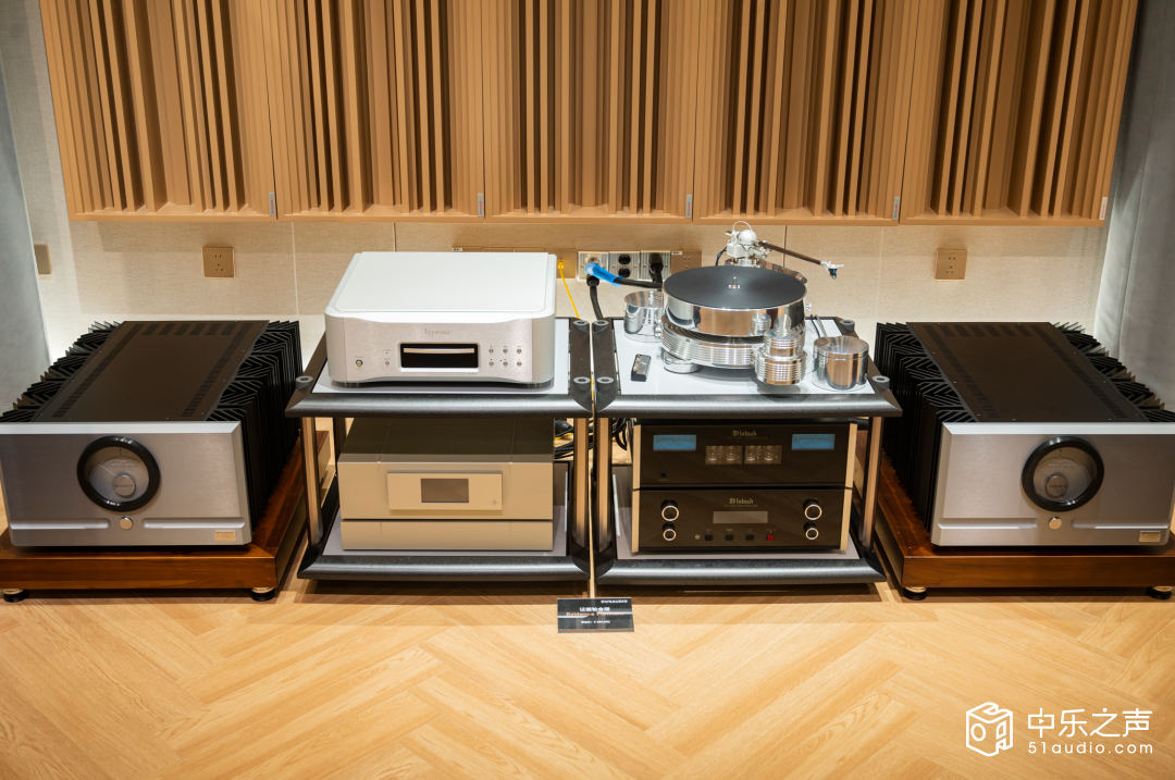 搭配这些势霸音箱的,是麦景图的“黄金阵容”(当然也会随时更换和升级):麦景图标志性的“黑色面板+蓝色表头+翠绿LOGO”,开机时表头指针缓缓跳动,极具仪式感;为了让顾客更好地感受家庭场景下的音质表现,乐颂坊还专门打造了一间专用试听室:房间面积约25平方米,墙面做了声学吸音处理,地面铺着厚地毯,摆放着与普通家庭客厅相似的沙发、茶几与装饰画。在这里试听,顾客能直观感受到器材是否适合自己家庭使用,避免了“展厅听着好,回家听着差”的问题。