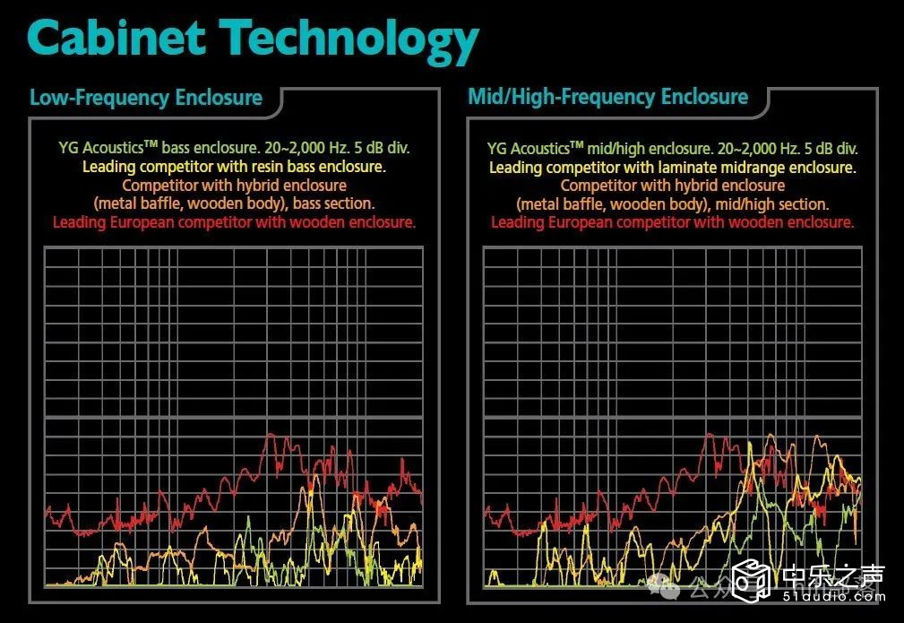 YG的喇叭箱体都是使用整块航钛等级(aircraft-grade aluminum)的铝材,以CNC方式加工制成,再用特别的压力、扭力技术结合起来。喇叭箱体该使用什么材质一直是High End音响中最热门的议题,到底要使用什么样材质的箱体才能具有最小的共振及良好的阻尼特性,或者是一般所说的音响性及音乐性要如何都做到最好。在经过无数的研究后,YG成立时设计的第一对喇叭开始,就决定使用铝金属作为箱体材质。从YG原厂的技术白皮书可以看到,相对各种不同材质,YG箱体在低频、中频/高频的振动测试,远远优异于使用金属面版、木头混合式箱体的喇叭。图中最下方的绿色曲线为YG,黄色、橘色与红色分别代表其他不同材质箱体的喇叭。
