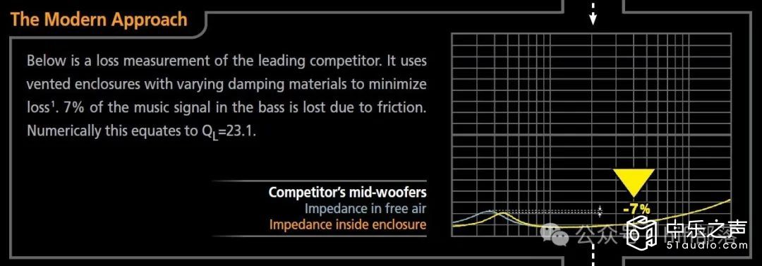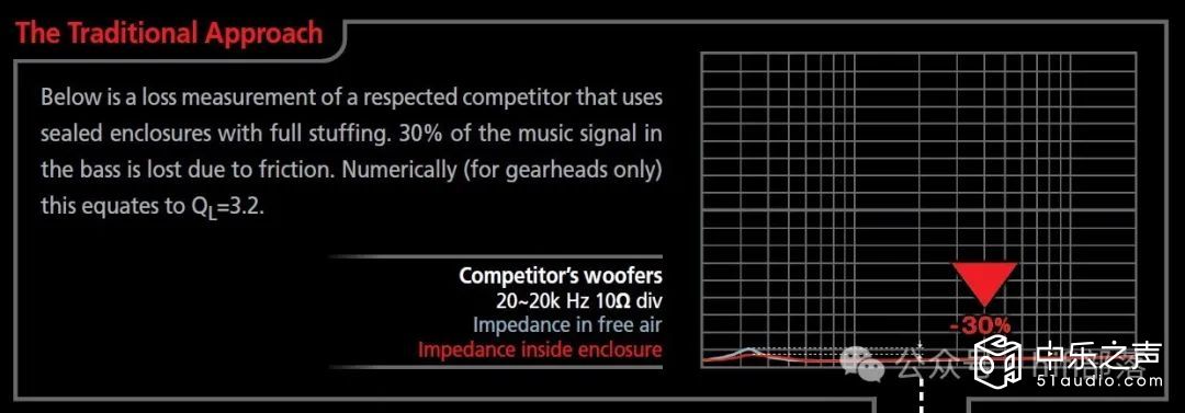 这是市面上知名使用低音反射式箱体设计,并填满各种阻尼材料的喇叭,与单体完全在自由空气中发声比较,可看到低频的音乐讯号因为损耗失去了7%。