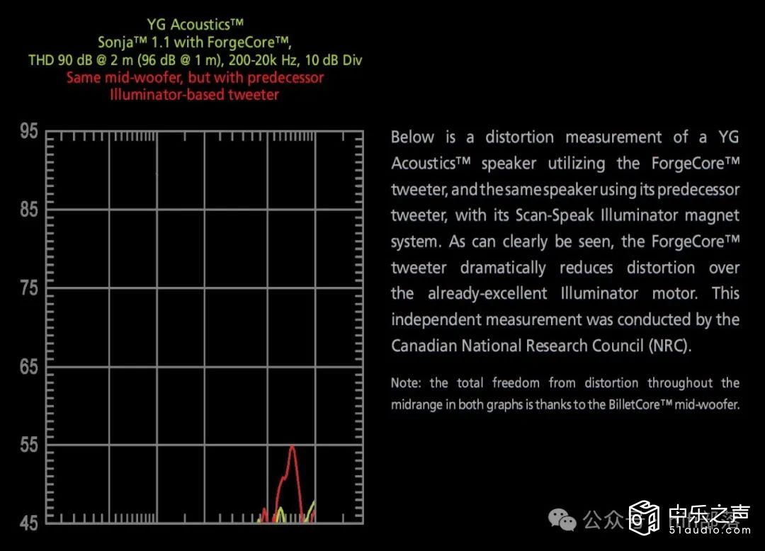 一般传统的高音单体制造商,大多使用2D设计与雷射切割方式制作,YG的ForgeCore™显然技术好上许多,这对声音的帮助亦是非常明显的,失真减少后高音也会变得更为耐听。下图是使用ForgeCore™(绿色曲线)与前一代使用Scan-Speak(红色曲线)的测量比较,ForgeCore™大幅度的减少了失真,这个测试数据来自于加拿大国家研究委员会(Canadian National Research Council, NRC)。