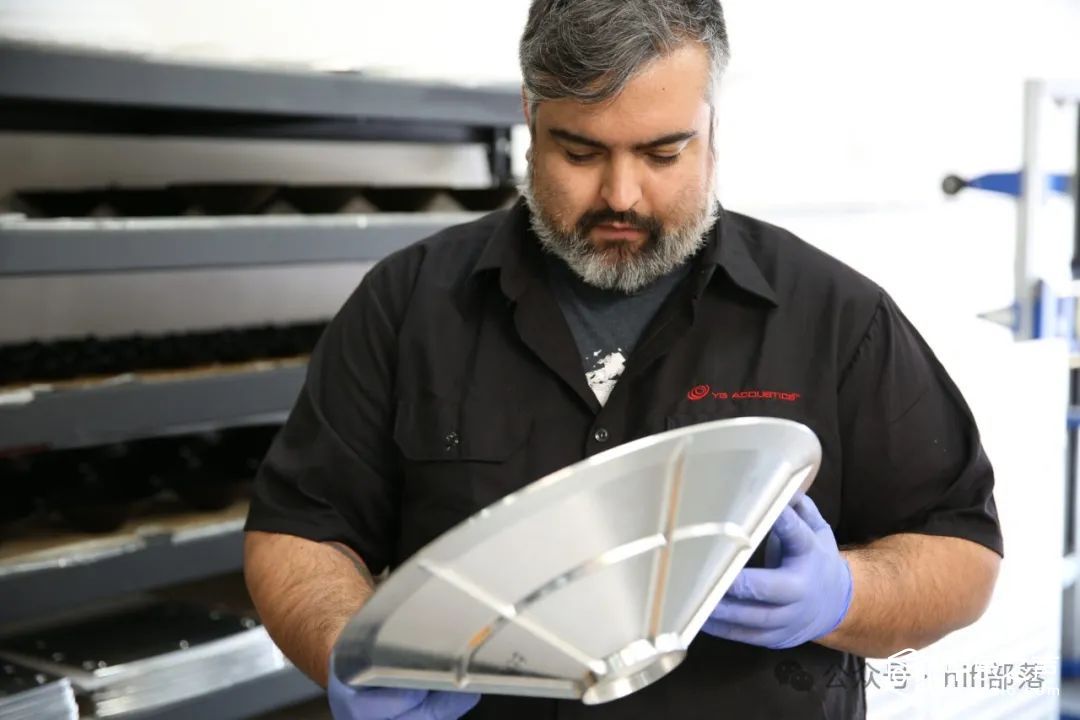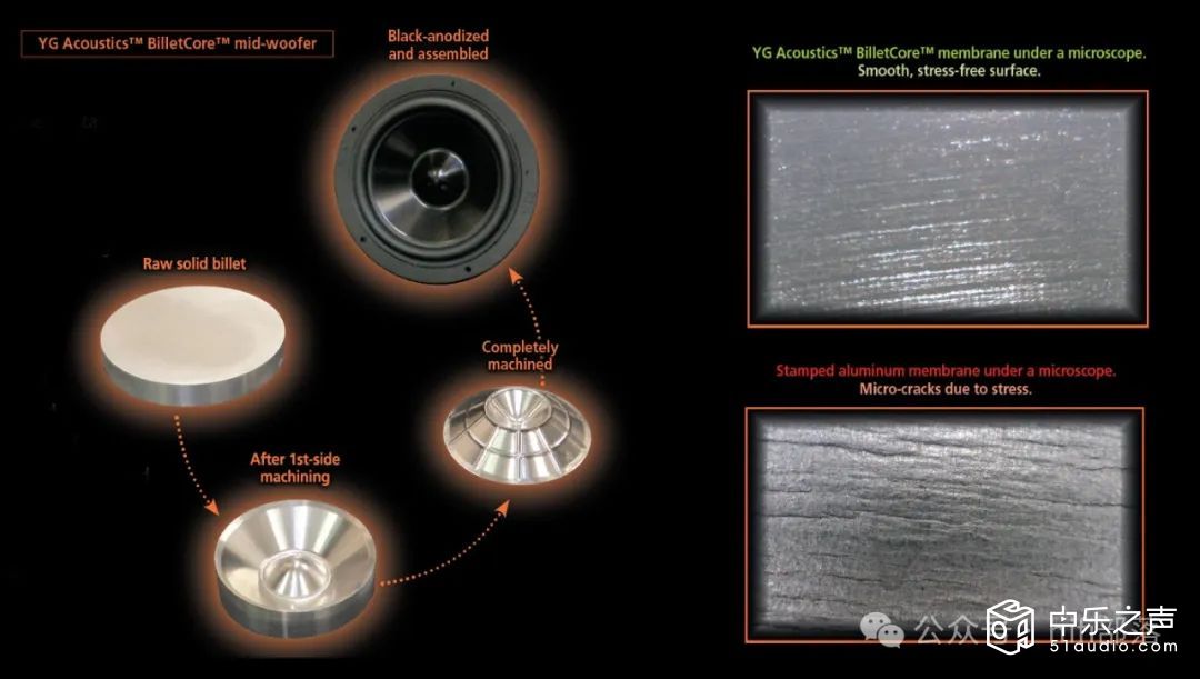 第二项超级武器:完整的CNC精密金属加工技术。YG的喇叭箱体都是使用整块航钛等级(aircraft-grade aluminum)的铝材,以CNC方式加工制成,再用特别的压力、扭力技术结合起来。而且YG的单体振膜——BilletCore™振膜也是从一整块的航钛铝合金经过数小时的CNC精密加工而完成。