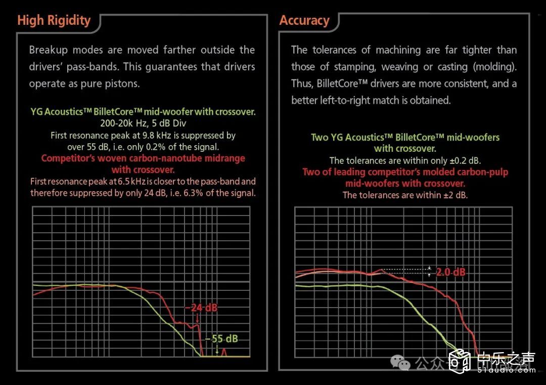下方为BilletCore™中低音单体与其他品牌单体的测试比较,左图可看出BilletCore™更为坚固(绿色曲线),第一个共振峰值发生在更高的频段9.8kHz,并有效抑制了55dB,其整体影响声音讯号约0.2%而已。右图可看出BilletCore™表现更为精准(绿色曲线),其误差在正负0.2dB以内。