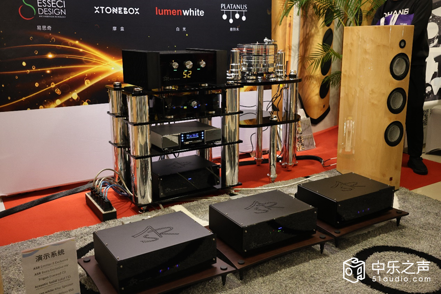 演示区内,ASR Emitter ll Exclusive四件套分体电源功放机凝聚成一道独特的风景线,呈现出令人惊叹的视觉效果。现场有发烧友提问:这也能叫合并机?