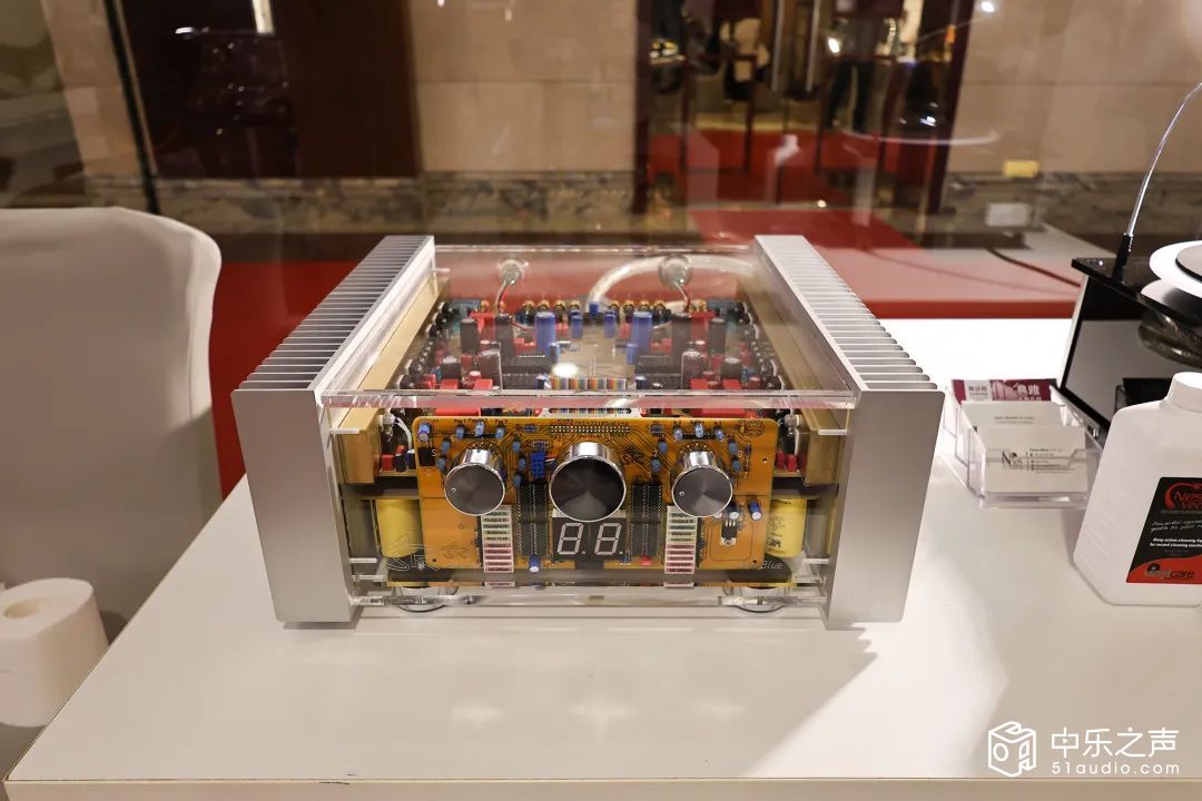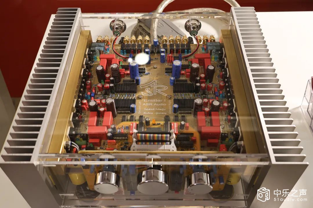 除了演示系统外,新昇音响还静态陈列了ASR Emitter I Clear Blue(1号高清蓝版)的主机,机箱为透明的亚克力材料制成,“五脏六腑”能充分呈现给用户细赏,而且,内部线路严格遵从左右声道对称设计,五颜六色的电子组件整齐焊接排列,呈现出一种电子世界的建筑视觉美感。