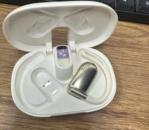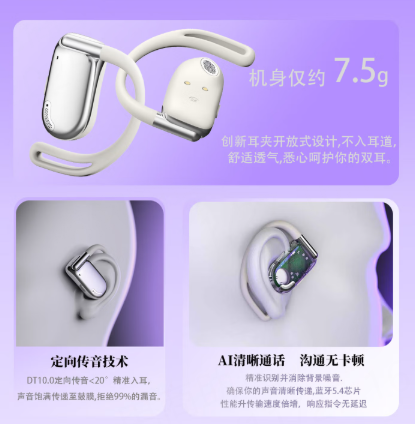 开放式设计,单耳乐约7.5克,和一张A4的重量差不多,佩戴也是及其的舒服,耳挂处采用镍钛记忆金属,外部包裹硅胶亲肤材质,不压耳廓。长时间的佩戴也是很舒服。对佩戴眼镜的用户也是非常的友好。
