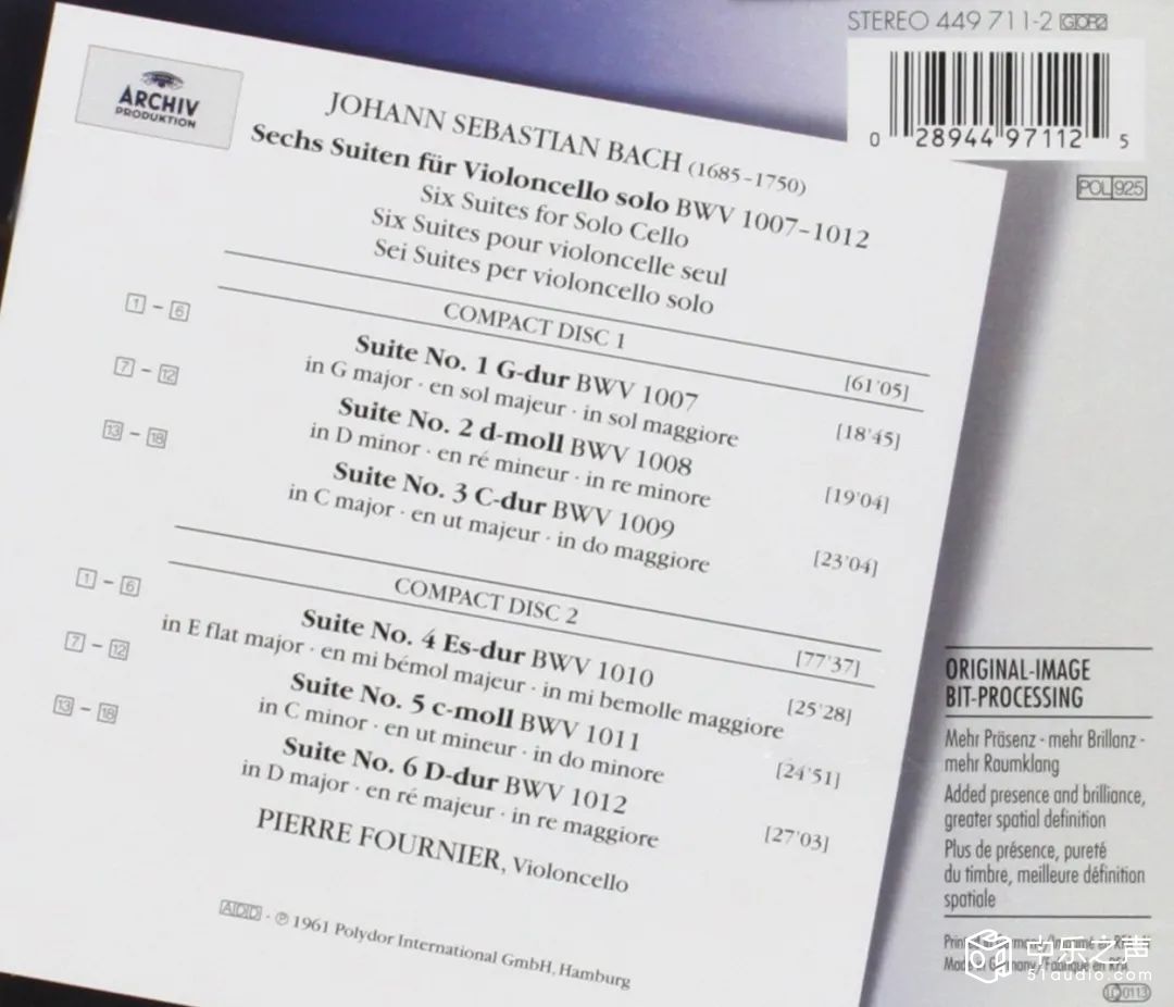 此版巴赫“大无”组曲录音是富尼埃为Archiv公司录制于上世纪60年代初,它是衔接富尼埃与前辈大师卡萨尔斯之间最亲密的曲目。几十年来,这套录音一直是同版中最受欢迎、从未自畅销榜上退下来的录音。
