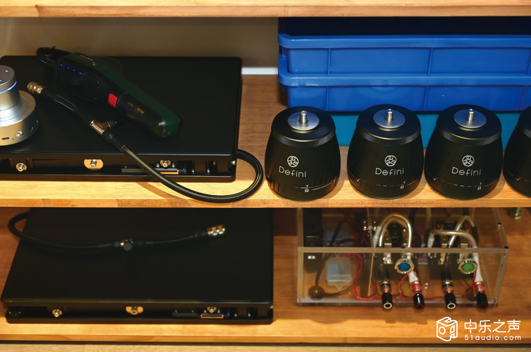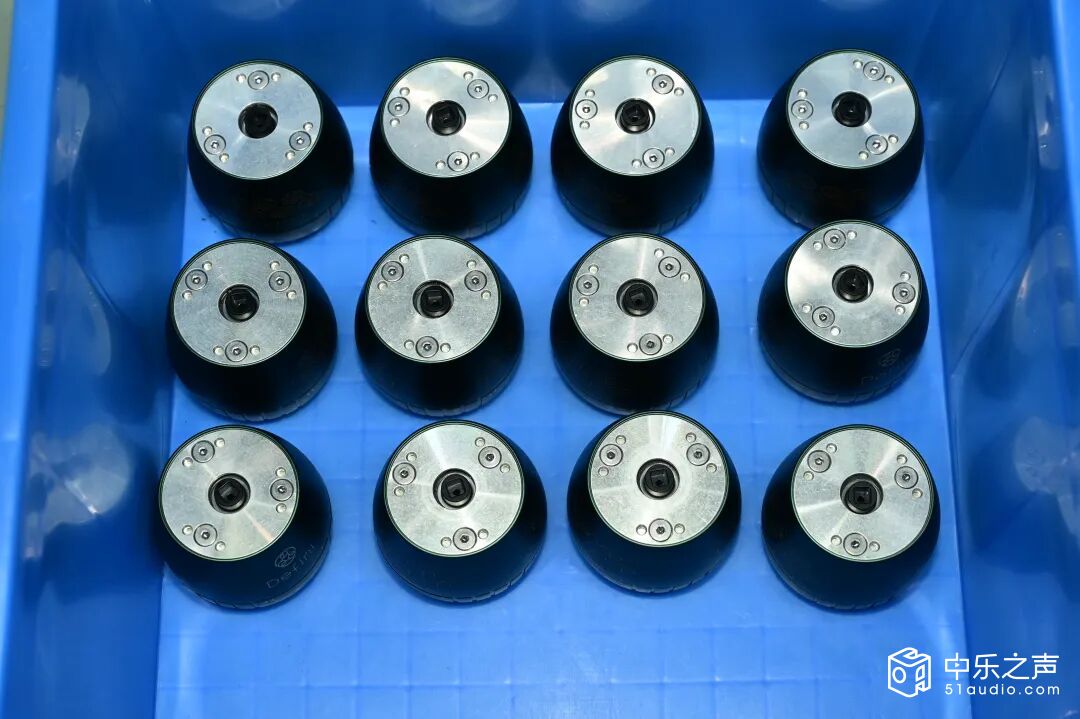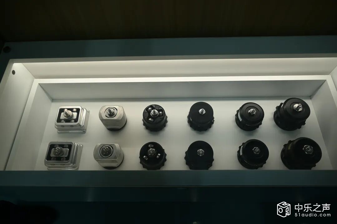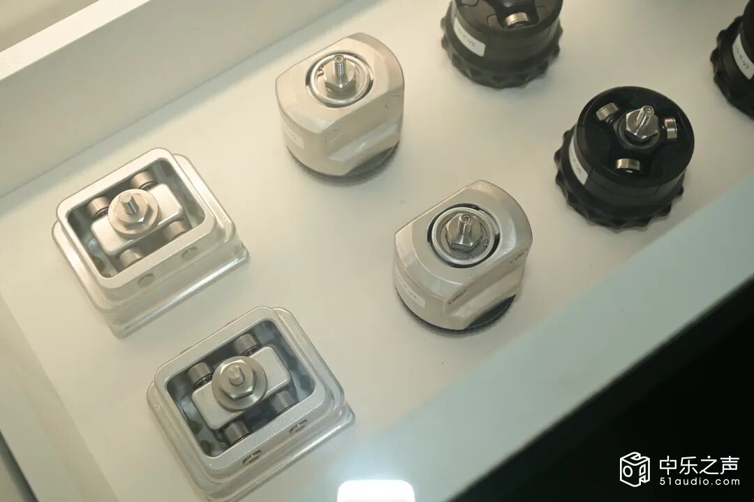 车间的展示墙上,张贴着Defini全系列产品的核心参数:DC系列针对落地扬声器与低音炮,承重从50kg至500kg不等,螺纹尺寸涵盖M8、M10、M12等多种规格,满足不同设备的安装需求;VA系列适用于功放、DAC、CD播放器等音频组件,采用轻量化设计,同时保持出色的减震性能。每一款产品的参数都经过反复测试验证,确保在实际使用中稳定可靠。