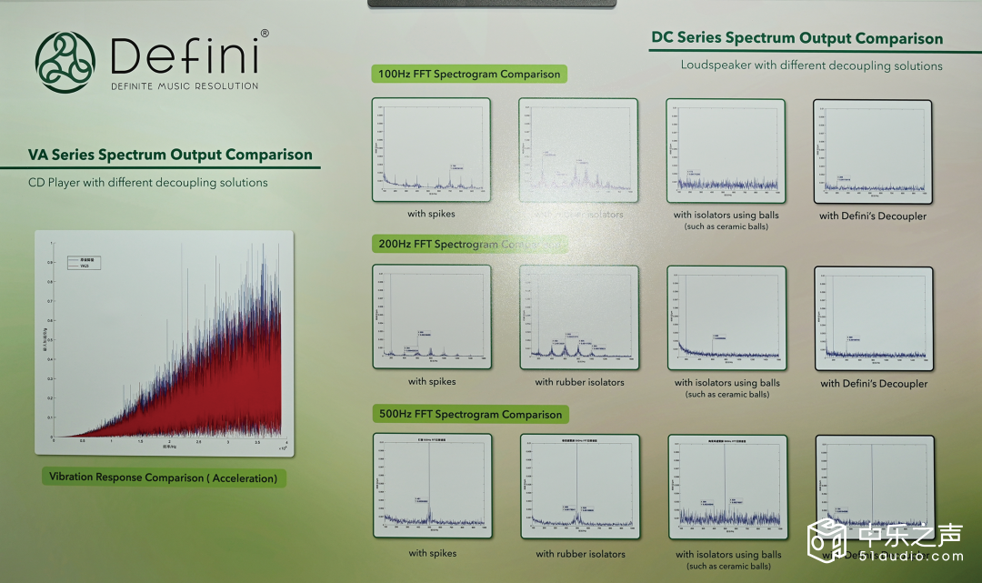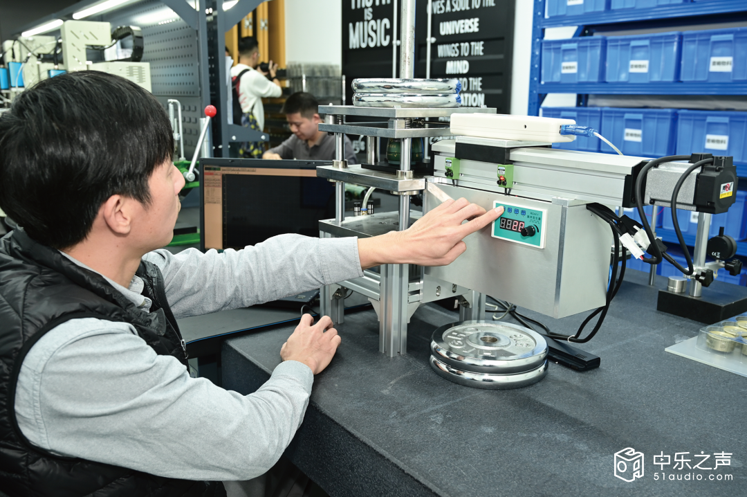 离开研发工作室,我们来到了工厂的专业测试车间。这里是Defini产品的“终极考场”,各种精密测试设备一字排开,其中最引人注目的便是那台双激光测振系统。测试工程师正在对Defini DC100型号避震脚垫进行性能测试,我们有幸近距离观摩了整个测试过程。 “大家可以看到,当音箱工作时,箱体振动幅度为0.05微米,但台面的振动幅度仅为0.002微米,振动传递率仅为4%。”工程师指着屏幕解释道,“这意味着DC100几乎阻断了绝大部分振动的传递,实现了箱体与支撑面的物理分离。”为了进行对比,工程师随后将DC100替换为某知名品牌的金属脚钉,再次进行测试,结果显示台面振动幅度升至0.015微米,传递率达到30%,差距一目了然。除了振动传递率测试,还有谐波失真测试与声场精度测试。在谐波失真测试,使用DC100后,20Hz-20kHz频段的谐波失真率平均降低了60%,尤其是中低频段的二次谐波与三次谐波得到了有效抑制,让声音更加纯净自然。传统避震方案无法有效控制振动反弹,导致箱体产生寄生谐振,进而引发谐波失真。而Defini的机械解耦技术,从源头切断了振动反馈路径,自然也就减少了谐波失真的产生。”