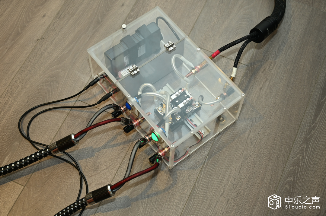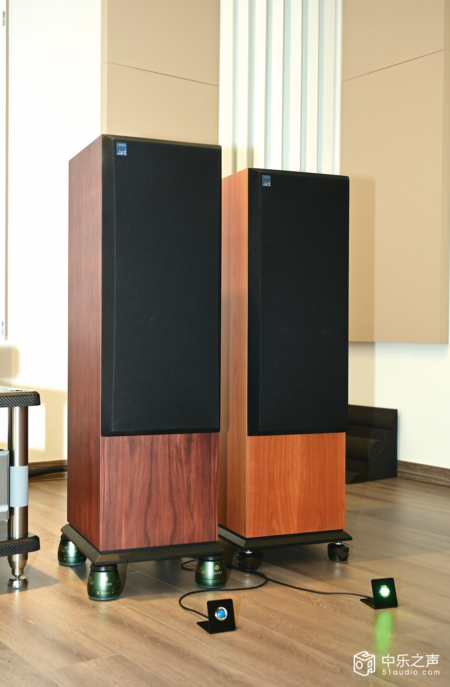 Defini工厂探访的最后环节就是三楼专业听音室的实战演练。这是黎生亲自设计的“声学圣殿”,房间的墙壁与天花板采用了吸音与扩散相结合的声学处理,地面铺设专用隔音地板,整体混响时间控制在0.3-0.5秒之间,完美符合Hi-Fi听音的声学标准。听音室中央,两对一模一样的ATC SCM 50 TASL落地音箱对称摆放,分别安装着某国际知名品牌的避震脚垫和 Defini DC100避震脚垫,黎先生特意在喇叭线靠近音箱接线柱那头做了个装置,一模一样的喇叭线分接在两对ATC SCM 50 TASL音箱上,通过遥控器即可秒切音箱系统,实现两种脚垫效果的瞬时切换,能够避免器材重新启动带来的音质波动,让对比更加公平直观。前端系统使用TEAC VRDS-701CD播放机、NPDG PassLabs XP22电源分体前级与NPDG PassLabs XA-60.8单声道后级。前端系统与两对更换不同脚钉垫的音箱甚至线材都完全一致,确保声音的差异仅来自避震脚垫。