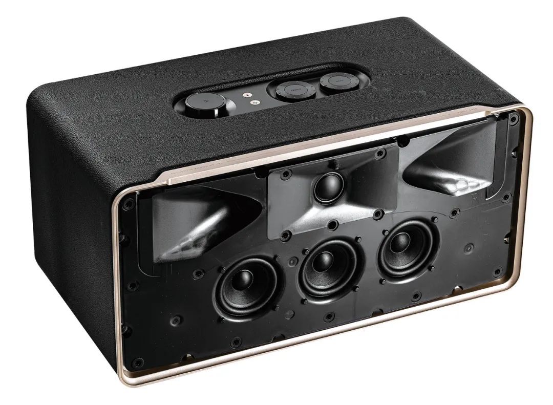 JBL音乐世家500尺寸为447x256x240mm、重7.8公斤,非常适合放在台面上作为桌面音响系统。JBL音乐世家500最吸引人的无疑是它的外观设计,颜值非常高,黑金色的配色让整个音箱显得既沉稳又富有设计感,尽显低调奢华。表面再生纱面料的格栅设计让整体音箱实感更上一层楼。回顾下JBL的以往音箱,就能够发现JBL音乐世家500格栅设计源自于JBL经典音箱L100 Century。音箱的四周采用香槟金色的铝合金材料,相较于纯金色,香槟金在设计语言上就会显得更加沉稳不跳脱,低调内敛的同时增添了一份独特内涵,表面的皮革贴片不仅使其在质感上得到提升,还显得更加百搭。JBL音乐世家500低调奢华的外观能够和谐融入各种家庭装修风格,即便摆在客厅使用也不会显得突兀。