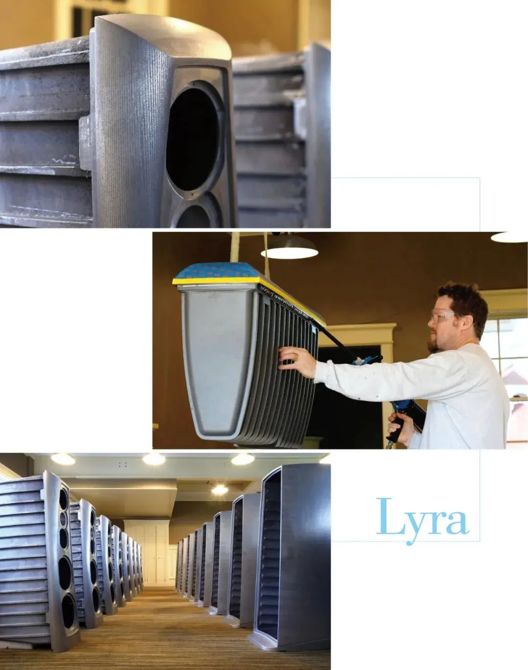 Lyra 的单只重量超过500斤,两块独立的箱体皆为一体成形,并且精密地嵌套在一起,内外箱之间在注入特殊阻尼物,坚固的箱体几乎在任何音压下都无法憾动,这些均必需由精密加工才能完成,因此Lyra外形不受一般生产方式限制,可以以最正确理想的设计安装单元,将箱体内部驻波降到最小并将周围多余的衍射降到最小,再生出纯净与具最大一致性的声音。