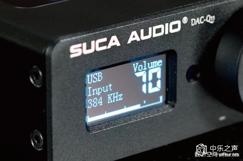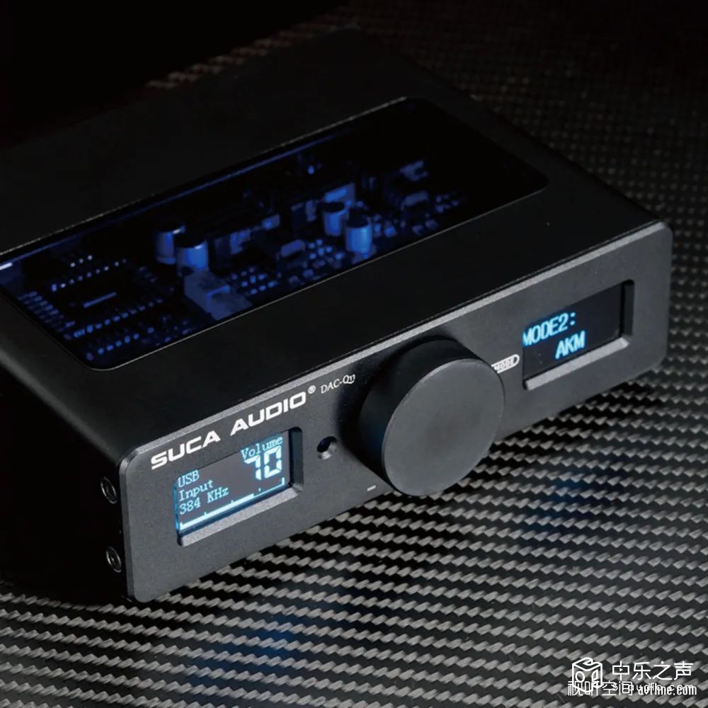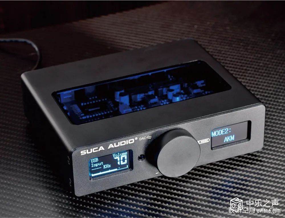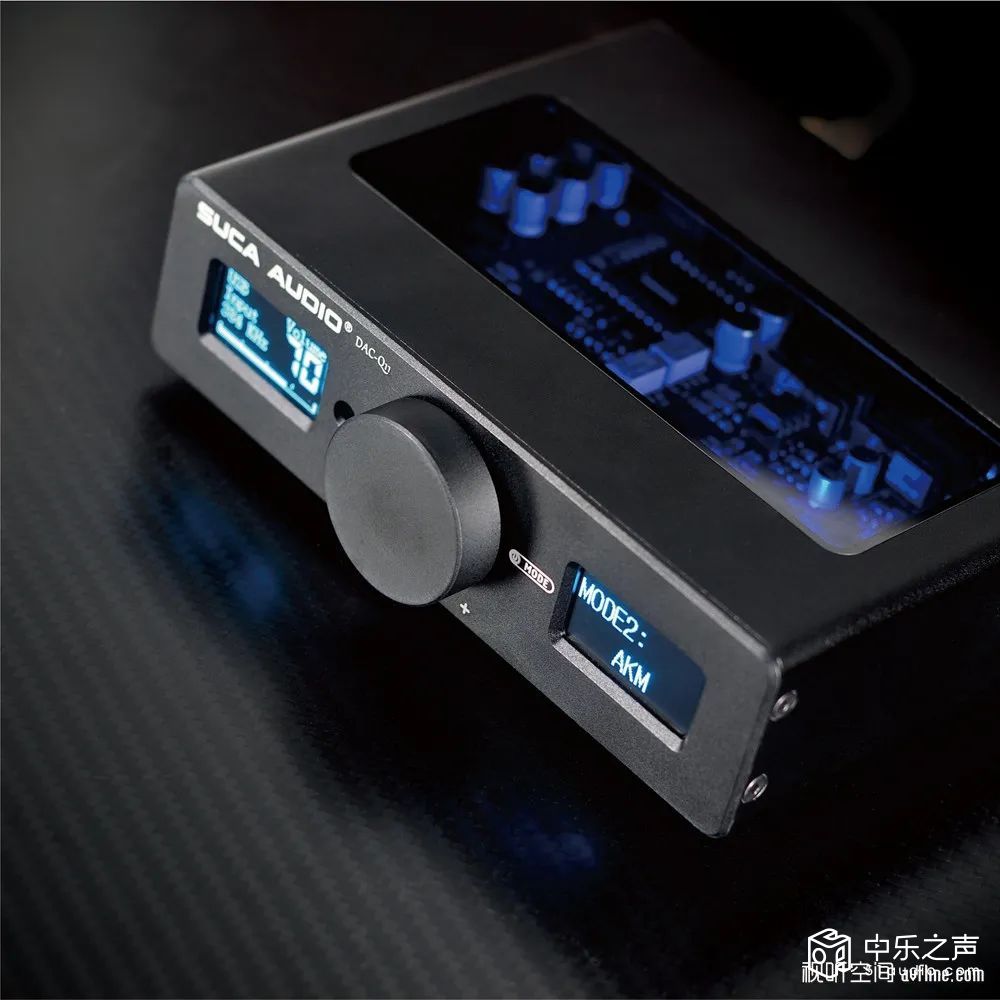 ■ SUCA AUDIO声优创的DAC-Q11双核心解码器采用了黑色磨砂铝合金外壳,线条刚中带柔,中间是硕大的一体式多功能开关旋钮,左右对称的OLED点阵式显示屏像一对会说话的蓝眼睛