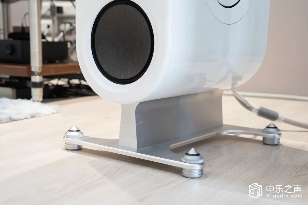 音箱底部的设计很特别。一般音箱底部多是平的,平面才能摆放,这很合理。但 FR10、FR20、FR30 三款落地音箱的底部却都是圆弧状的,再以一个铝合金制的特殊底座支撑起来。因为音箱底部与底座接触面少,就让音箱好似悬浮在空中一样。四个大型铜质脚钉可调高度,方便用家调整音箱水平。原厂还附上一组塑料脚垫,用家可根据自家地板环境来换用。