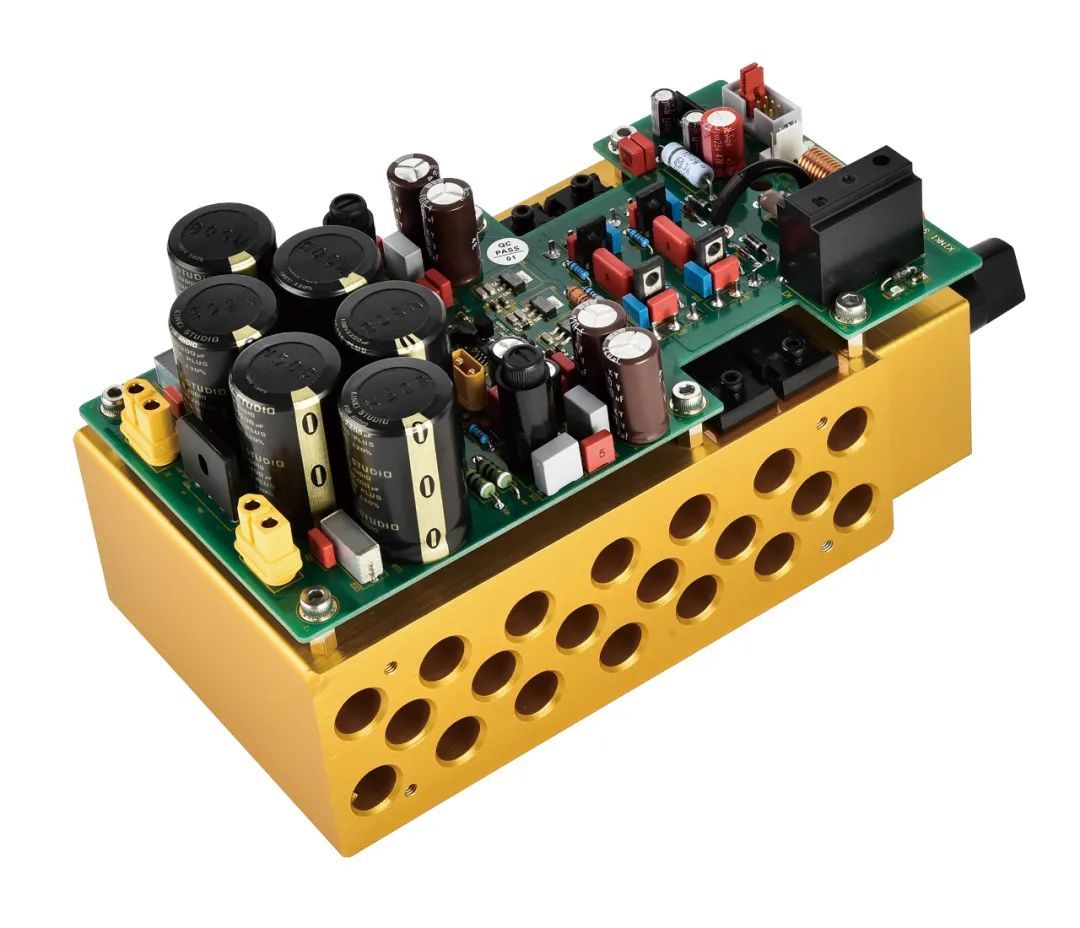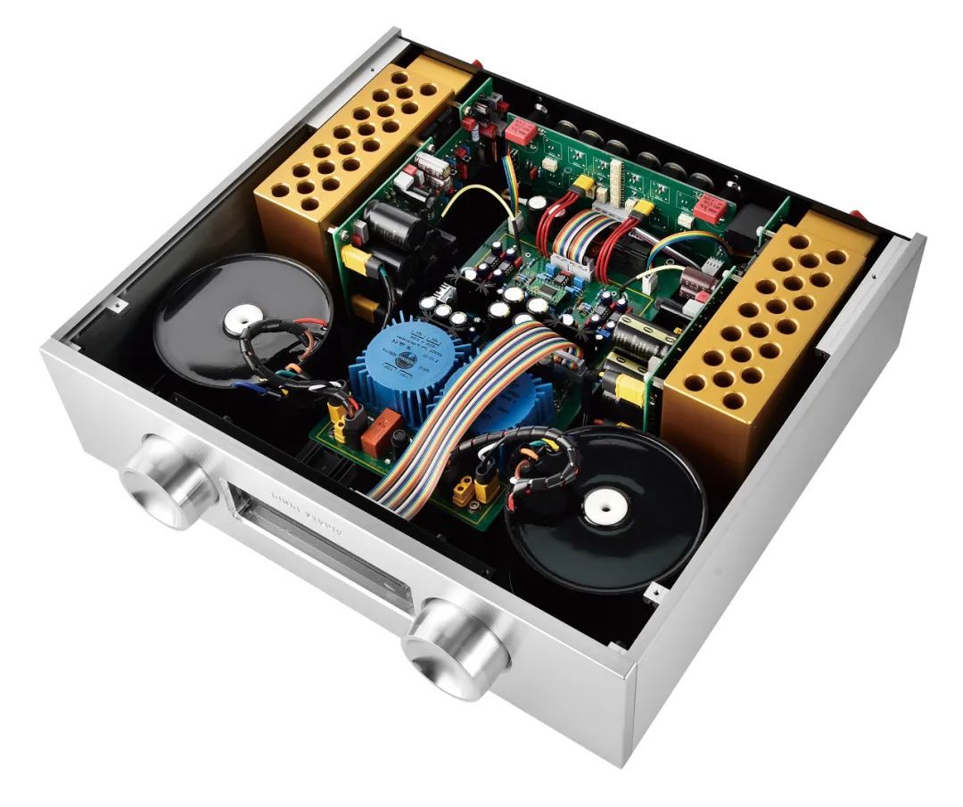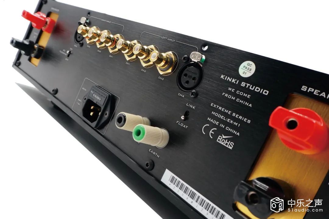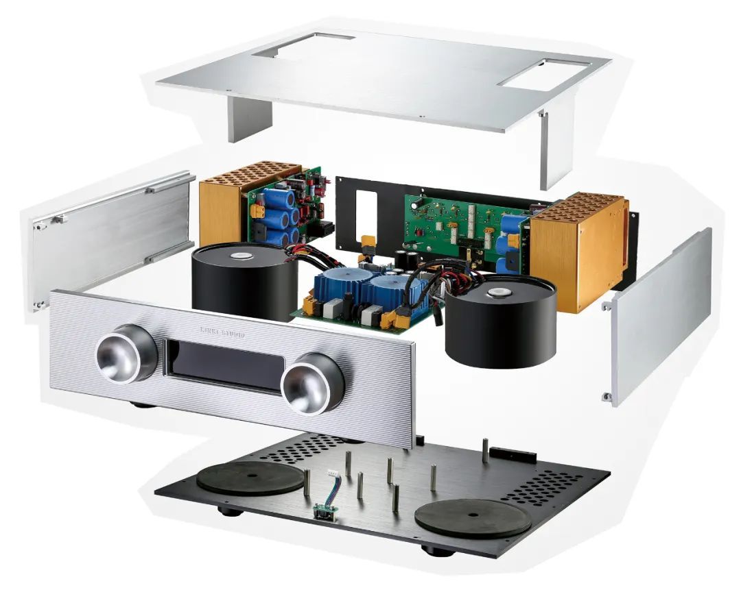 EX-M1是KINKI STUDIO的旗舰合并功放,其设计理念强调电路分离与低失真。内部采用双单声道架构,左右声道各配备一颗400VA环形变压器独立供电,这种设计避免了传统合并功放中左右声道信号可能产生的串扰问题,使声场定位更精准。前级与显示控制电路另设独立变压器,彻底隔绝干扰,信噪比高达103dB。功率放大级每声道搭载两对Exicon MOSFET功率管,AB类模式下可输出215W(8Ω)的充沛功率,阻尼系数达400,能够很好地去驱动音箱。音量控制摒弃传统衰减器,选用MUSES 72320电子音量芯片,实现0.006%(A计权)的超低谐波失真,确保音量的细微调整不损失细节。机身采用厚铝板切削工艺,在顶部能看到特殊设计的金属设计,兼顾散热与机械稳定性,外观简约却充满工业美学张力。在机身背部端口具有三组RCA立体声模拟输入,还有一组XLR平衡立体声模拟输入,还有一组喇叭线接线柱。