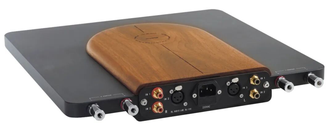 DL-100使用了与200系列类似的核心输出级设计,也是每声道仅有一对MOS管作为输出,声音保持通透、细腻、快速与高分析力。区别之处在于DL-200系列功率更大,需要配置动态供电电路来分摊输出管的发热;而DL-100发热量更小,因此做一些参数优化后,可以改为直接供电,设计更简洁。DL-200系列配有A/B二组电容组成的内部电源净化处理,抗干扰能力很强,而DL-100通过积累的布线经验进行优化,很大程度上保持了DL一贯以来声音背景干净的特点,甚至比很多高价进口产品更宁静黝黑。放大结构上,DL-200系列是全平衡放大设计,动态和速度更大,阻尼系数很高,对于大编制交响更有优势,是古典爱好者的利器。受限于体积,DL-100改为单端放大设计,声音更细腻耐听,阻尼系数适中,对各种音乐适应性广泛,尤其搭配都市家庭的中小型音箱系统。虽然架构不同,但输出管采用与200系列同样的Vishay大电流MOS,瞬间的电流输出与控制力有保障。Vishay是全球分立半导体(二极管、MOSFET和红外光电器件)和无源电子元件(电阻器、电感器和电容器)的最大制造商之一,质量优异,家用音响比较少见到。DL-100的机箱由整块铝合金铣制,为了减少冰冷感所以顶盖搭配了胡桃原木作为外壳的一部分,在视觉上赋予一丝生命的温度感。通过简洁的方与圆的线条结合,前卫的造型配合复古低调沉稳的配色,形成了很好的平衡,经久耐看。这也契合DL-100的声音特性,既有现代音响的细节和干净,又不会过激,有恰到好处的平衡,舒服的听音比例。