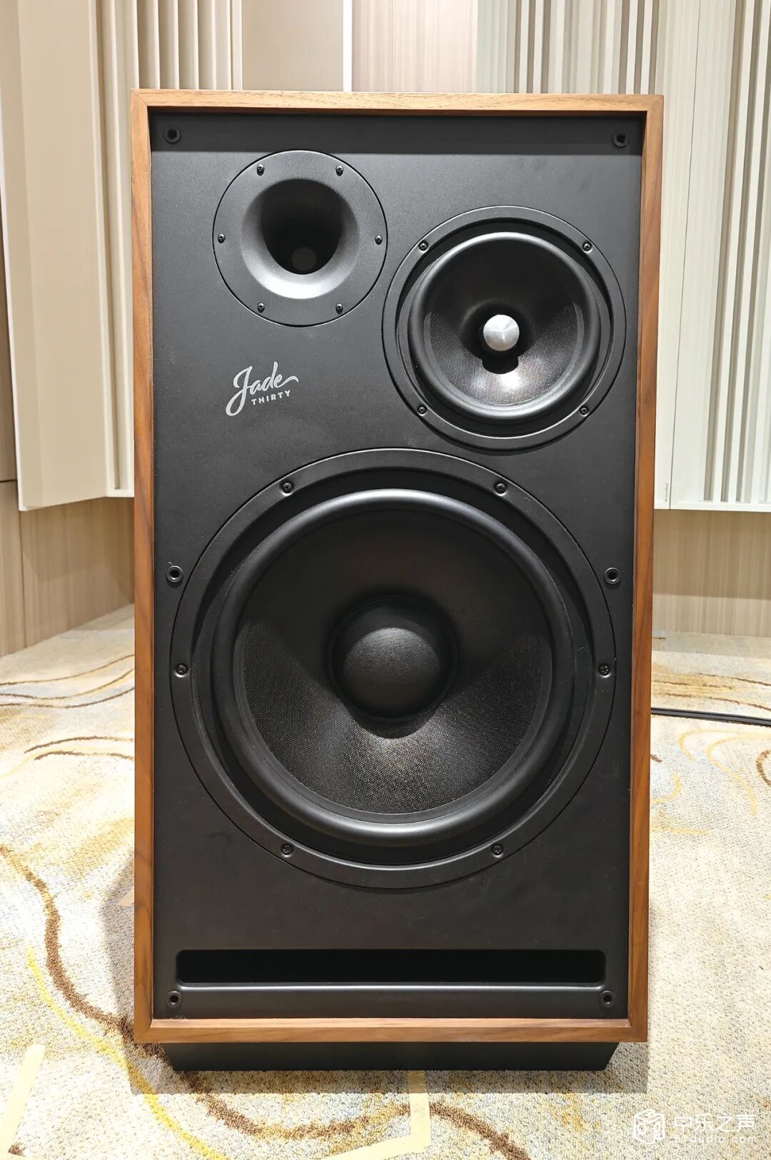 如果不细看,很容易将PYLON湃隆JADE 30和20弄混,还好三分频的特点“出卖”了它!虽说PYLON JADE 20是大体积书架箱,但是JADE 30可是实打实的落地箱!JADE系列融合了复古外观与现代技术,包括三种型号:JADE 10、JADE 20和JADE 30,每个型号都围绕定制设计的纸质低音单元和集成到专门设计的短 Tractrix 轮廓号角中的 BMS 压缩驱动器构建。JADE 30给人的第一印像是——庞大而不笨重。虽然拥有15英寸的低音单元,但整体比例协调,箱体采用经典复古设计,同时融入了现代元素。箱体采用漂亮的胡桃木饰面,做工精细,体现了东欧制造业的高水准。外壳由实心 MDF 面板制成,在关键区域有额外的肋和加固,确保结构刚度。通过特殊轮廓的脚实现的轻柔扬声器倾斜,将声波聚焦在听众的耳朵水平。整体由带有经典钉安装座的扬声器格栅完成。