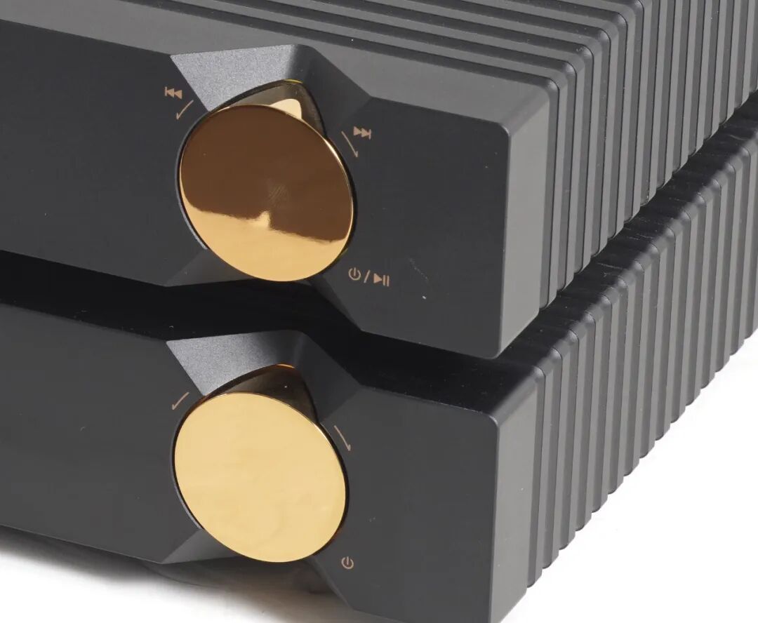 这套设备前面板右侧的金色旋钮格外引人注目,它不仅是操作的核心部件,更是整个外观设计的点睛之笔。这个多向旋钮不仅可以用来控制播放、调节音量等基本功能,还能进行菜单选择和参数设置,操作手感顺滑,反馈迅速且直观。在金色旋钮的上下两侧,各开一个三角形口子,这一设计不仅增加了产品的层次感,还方便用户进行操作。机身顶部和两侧留出多条平行的沟壑,不仅增大了散热面积,还让整个产品看起来更具科技感。实际上是ONIX Horizon产品线的各类设备设计语言都是这样统一的,这种统一的设计语言让ONIX欧尼士的产品在外观上具有极高的辨识度。
