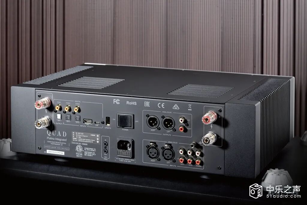 而QUAD最新推出的Platina(白金)系列,便是其串流解码产品发展的又一巅峰,从概念、研发、声学确认长达五年时间之久,是迄今为止QUAD最高端、最成熟的音频解决方案。而且以QUAD一贯的定价策略,尽管定位旗舰,Platina系列的价位依然可以算是相当亲民,性价比十足。目前Platina系列有串流数播和解码功放两款产品,而11月QUAD还将推出一款CD转盘,进一步完善产品阵容。外观方面,Platina系列延续了QUAD此前Platinum和Artera等台机系列的复古时尚风格,继承简约美学基因,机身采用厚重金属架构,既保证声学稳定性以减少振动干扰,又通过利落的几何线条塑造经典英伦质感。正面以细腻铝制旋钮与低调按键环绕高清TFT显示屏,形成触觉与视觉的双重焦点——旋钮的阻尼感经过千次调试,按键反馈清晰,显示屏则可精准显示音源格式、采样率等核心信息,兼顾操作精准度与视觉直观性。背板设计同样彰显旗舰品质,接口均采用镀金工艺处理,有效降低信号传输损耗。