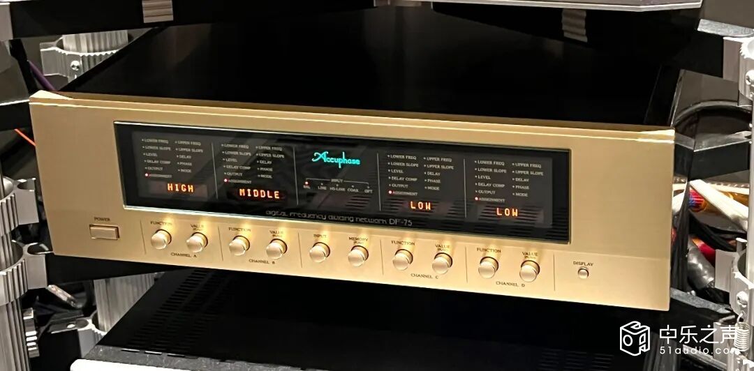 想改变ATC的音色,或者想让SCM300发挥更大潜力,最可行的方式就是电子分音,可以三路分音,也可以四路分音,力高音响采取规模最庞大的四路电子分频。搭配的是全套柏斯Pass的功放,以及金嗓子Accuphase第五代DF75数字分频器。DF75搭载64位浮点DSP芯片,提供4路分频输出,最多3101个截止频率点选择,覆盖从20Hz至20kHz的精细化调节需求。分频斜率由-6dB、-12dB、-18dB、-24dB、-48dB到惊人的-96dB。内置延迟补偿器,自动校正电路中的信号延迟确保相位一致性,也支持以0.5公分(以前是1公分)为单位调整喇叭单元间的延迟时间。A/D与D/A转换均采用ANCC线路,通过4组并联电路提升讯噪比(最高可到-123dB,大概是世界纪录了)。