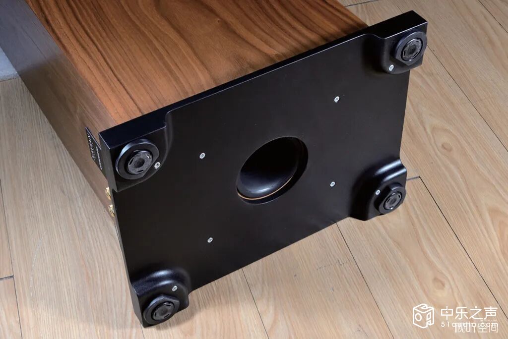 箱体底部的倒相孔正对地面,配合两侧带弧形通风口的高度可调底座,能将低频能量均匀扩散至四周,还能通过调节底座高度改变倒相孔与地面的距离,从而灵活调整低频的量感