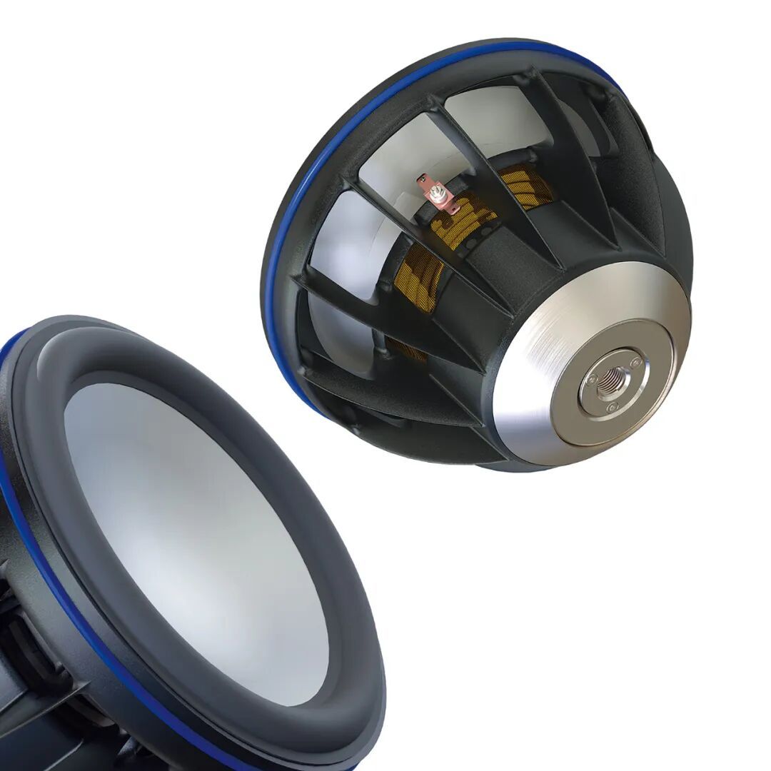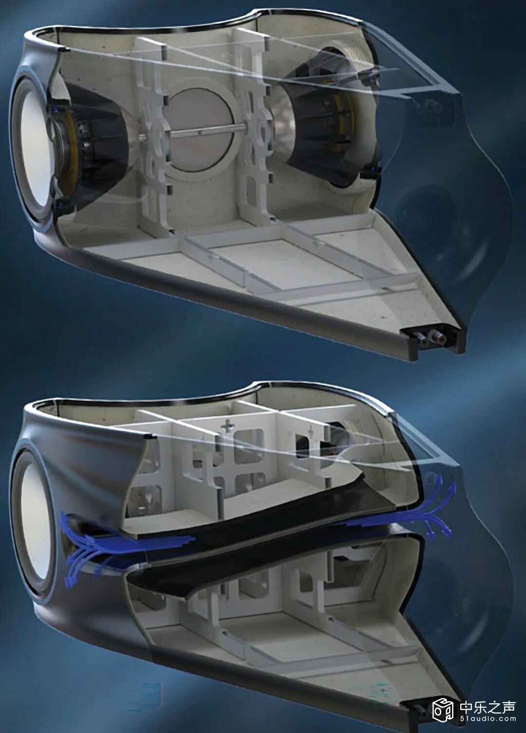 解剖图更清楚看到低音箱体结构与反作用力抵销的方式,箱体用玻纤维等复合材料制作,曲线没有平行面,加上复杂的内部支撑来强化箱体,让震动无从发生