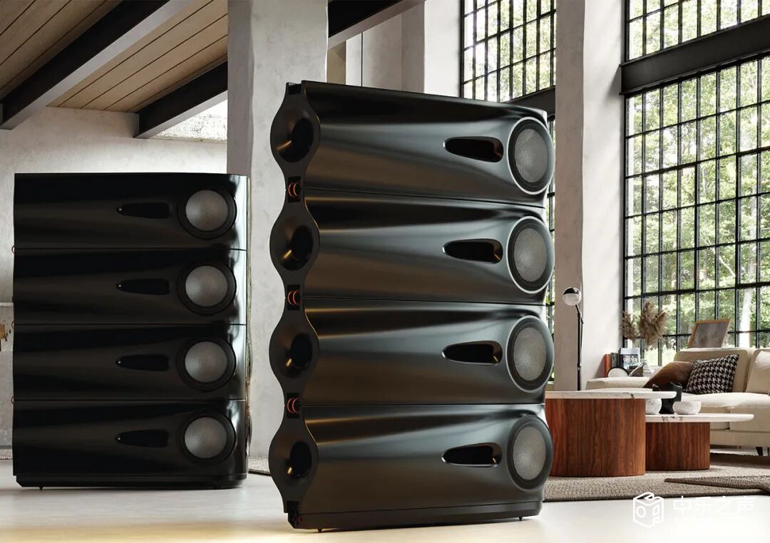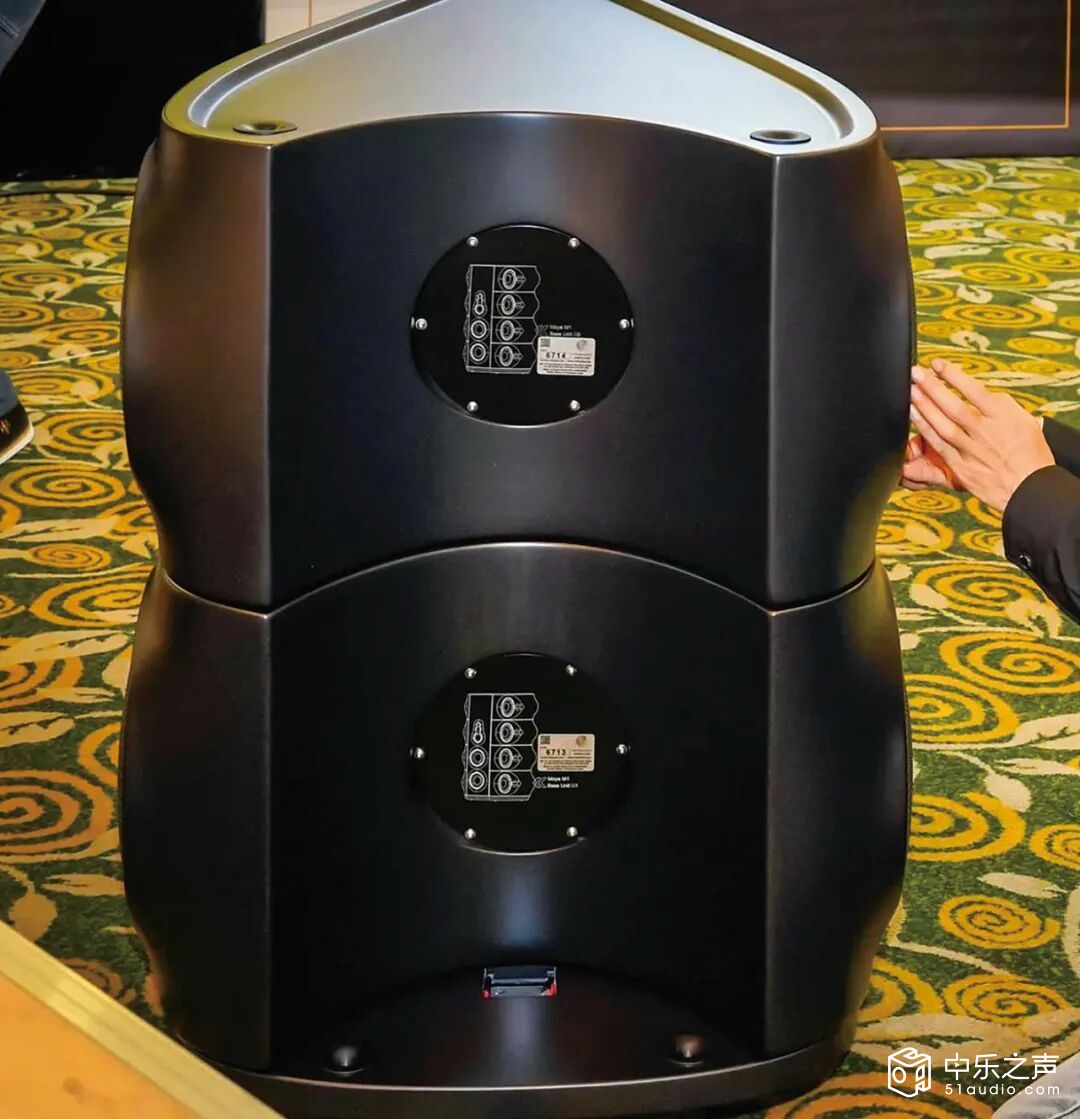 M1 Moya的深度超过1米,通过背后的腔室吸收能量,特殊的排气口可消除19Hz谐振与涡流效应在全球大疫情过后,Laurence Dickie将多年累积的经验,以及新材料、新技术总结,去年3月在中国首发他的终极爆款设计M1 Moya音箱。一方面作为Vivid Audio的20岁生日贺礼,二方面宣告这是50年来音响进化史上最大的突破与创举,第三则是向Vivid全球最大的代理商泽森音响致敬。Moya这个字起源于希腊和西班牙,意思是“伟大”或“卓越”,Dickie很有雄心壮志,让这对体型大硕大,五分频设计,每只音箱共搭载13只单元的巨无霸音箱名留青史。从正面看,M1 Moya音箱为四分频结构,音箱左右二侧分别有4只朝外发声的低音单元,虽然造型与其他Vivid迥然回异,但依然维持没有平行面的全弧形结构。尤其是侧面的低音声波导管,很多角度看起来都象是飞机的喷射引擎,圆锥状的进气口在单元后侧,然后逐渐往后收窄,最后到音箱背面形成四个圆形的排气口。如果不是透过现代的新材料,传统木材、金属都很难完成这种新奇曲线加工。