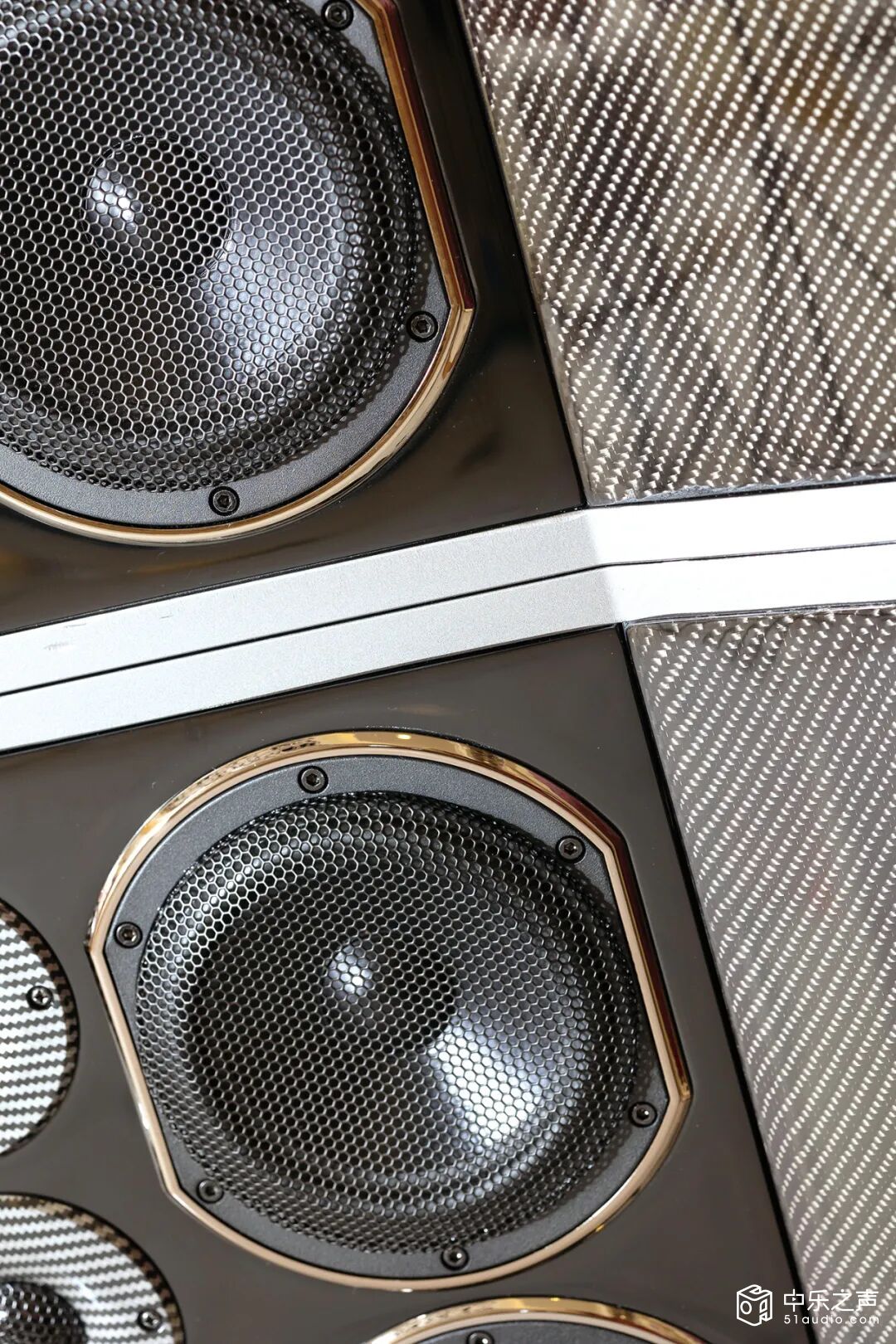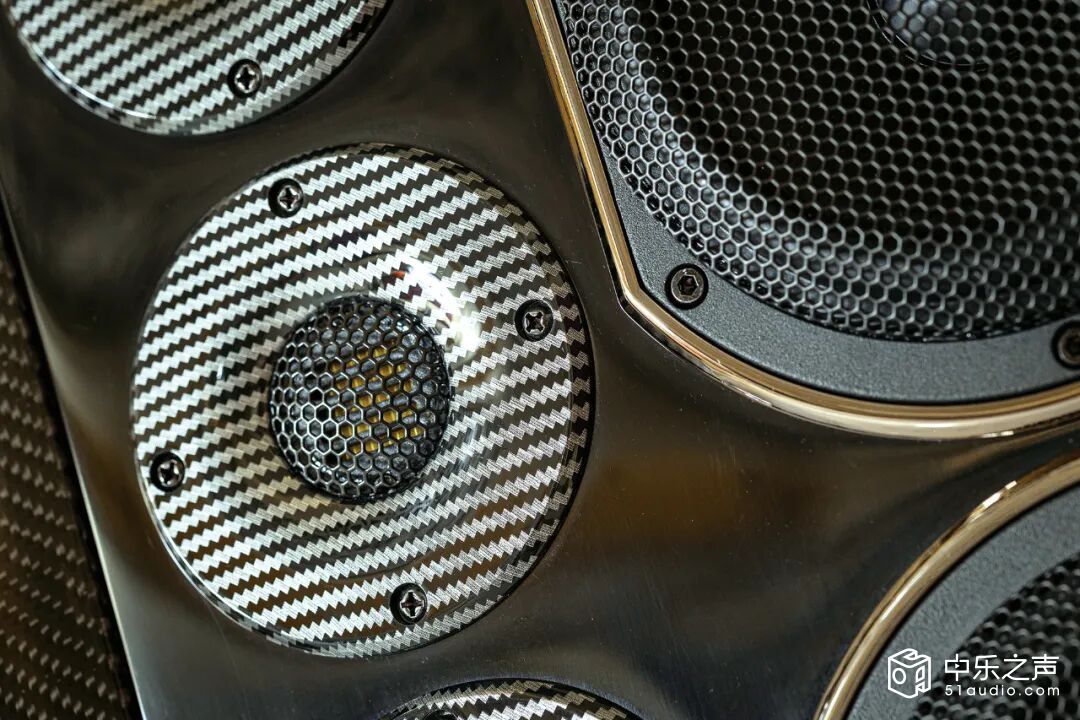 ▲超高音单元:迪贝斯自主研发的铝带超高音,频率响应达到非常的12 KHz -35KHz。面板采用最佳角度扩声设计,表面碳纤维处理,使声音通透性更好。