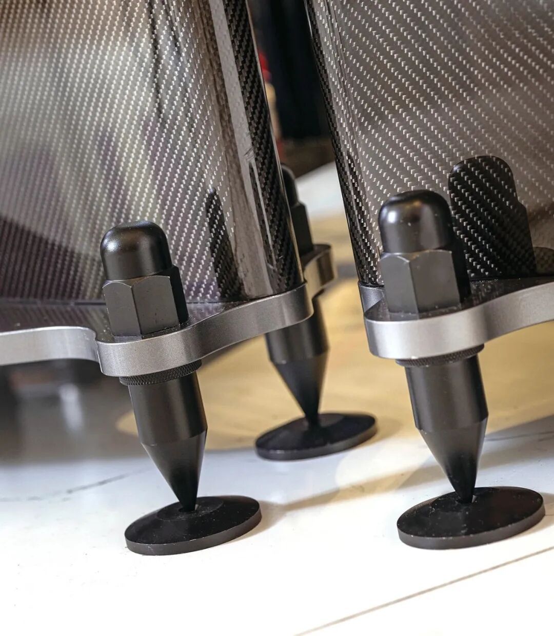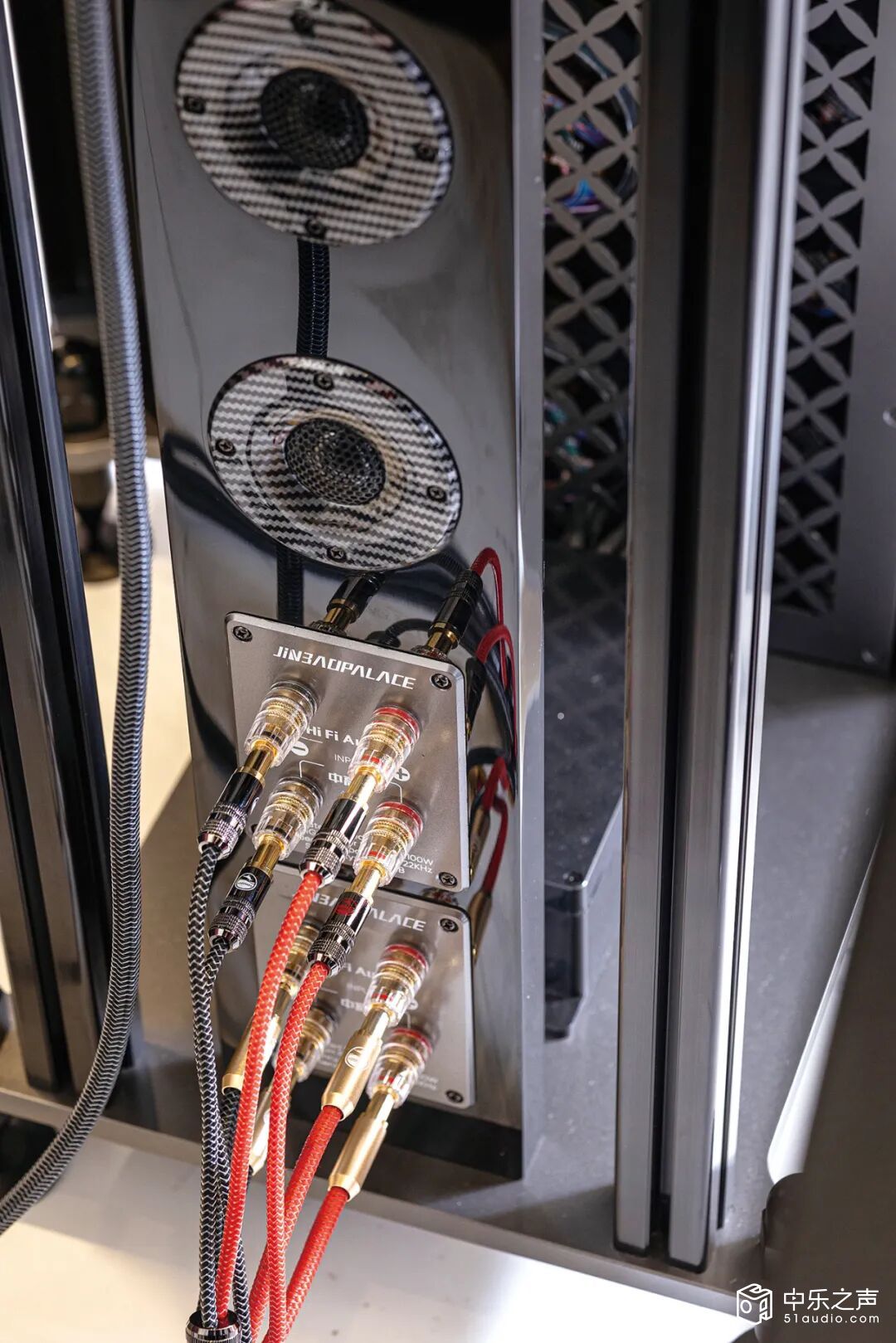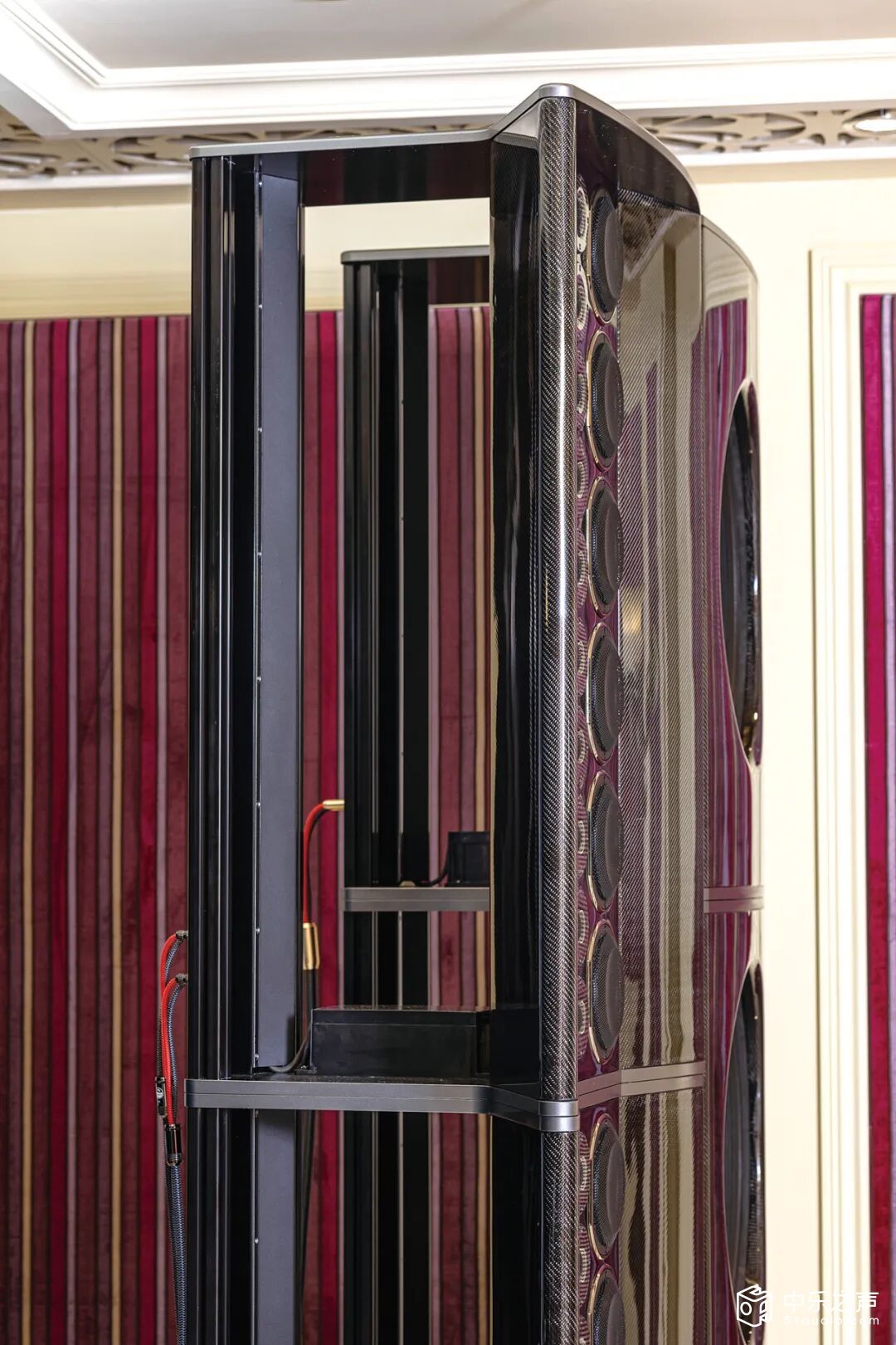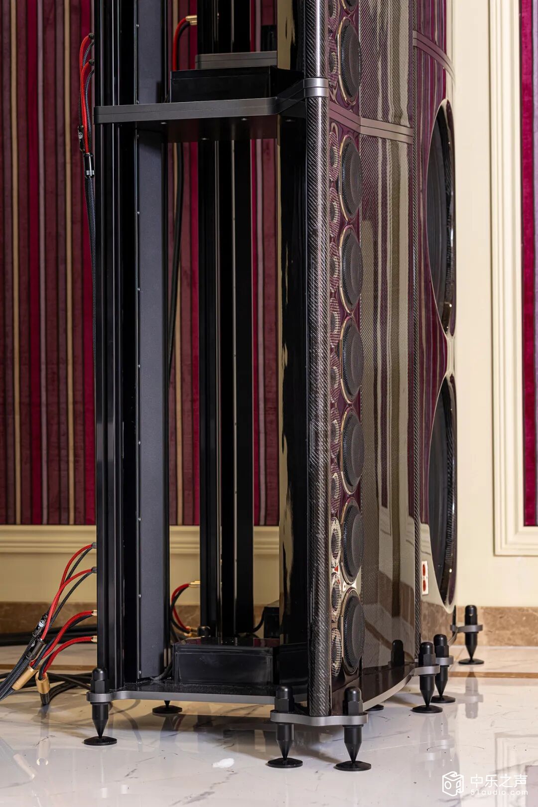 ▲扎实稳固的T形结构:迪贝斯金宝殿的中高音障板与超低音障板采用金属、碳纤维与实木混合,虽然是四只重量级脚钉可消除喇叭震动通过障板与骨架向地面的传导,但金宝殿系列扬声器整体结构呈T型,这种三角形结构最稳固最扎实