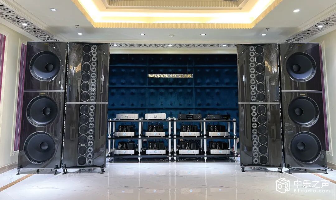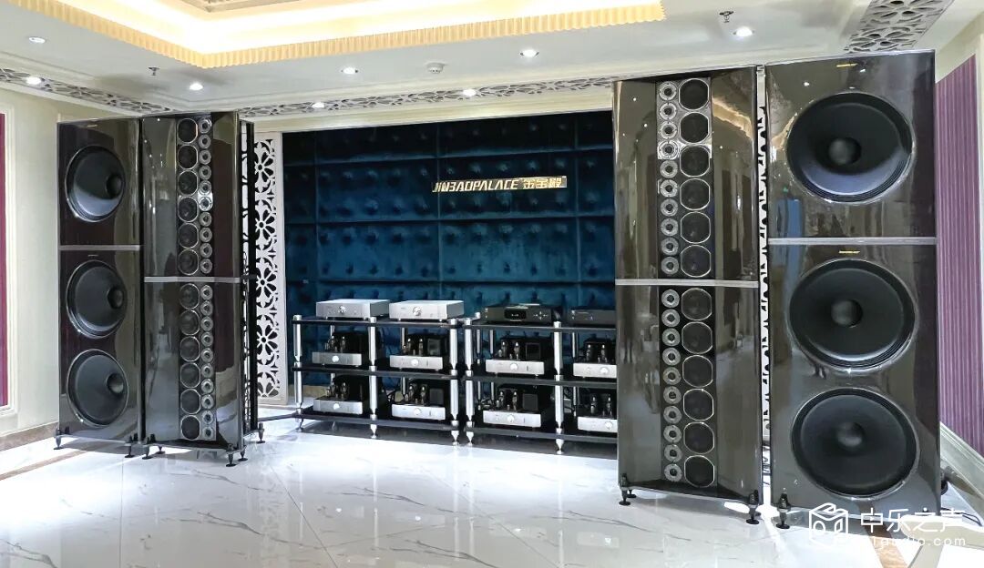 金宝殿1号四件式音箱,整套系统的高中低音扬声器达到了创纪录的100个,重量达到了1058公斤,大号角设计有效展开面积达到了1.8平方米,是目前世界上最大的号角之一
