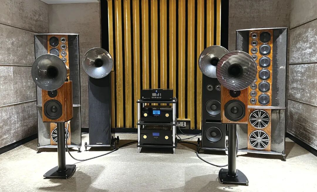 传播快乐的音乐是迪贝斯的愿景,让梦想成为现实则是迪贝斯的使命至于新品牌又卖到比较高价,会有市场吗?东少解释,其实迪贝斯的产品线范围很广,除了旗舰金宝殿8号的售价超过百万元,其他如钻石山、金矿、法蒂斯等系列含括了各种消费群体的需求。钻石山系列结合了现代科技和传统工艺,音质和外观都非常出色。金矿系列特别适合家庭使用,每款音箱都有独特的低音效果。最便宜的一对号角书架音箱,使用碳纤维大号角,售价仅一万多元,人人都可以买得起。严格说起来,金宝殿8号的性价比都少有匹敌,国外品牌要买到四件式音箱,结合了障板结构、线阵列单元配置、大号角等优点,没有数百万元是不可能的。美国某品牌的四件式音箱,号称售价一千万元人民币,还不包含搭配的功放。迪贝斯最早选用同是嘉兴音响企业音乐时空的KT88胆机搭配,现在换用丽磁LM-603PA KT170单声道后级(输出功率高达130W,低失真1%),效果有了很大的进步,功放都包含在售价之内。仔细观察,会发现金宝殿8号是由四个大组件构成,中高音分成上下二个音箱,每个音箱由一部后级驱动;3只21英寸低音也是分成二箱,分别由二部后级驱动。金宝殿8号分音器相对简单,灵敏度高达92dB/8欧姆,很容易驱动,本身不用电子分频,透过二部前级调整低音的量感,很容易获得良好的平衡度。