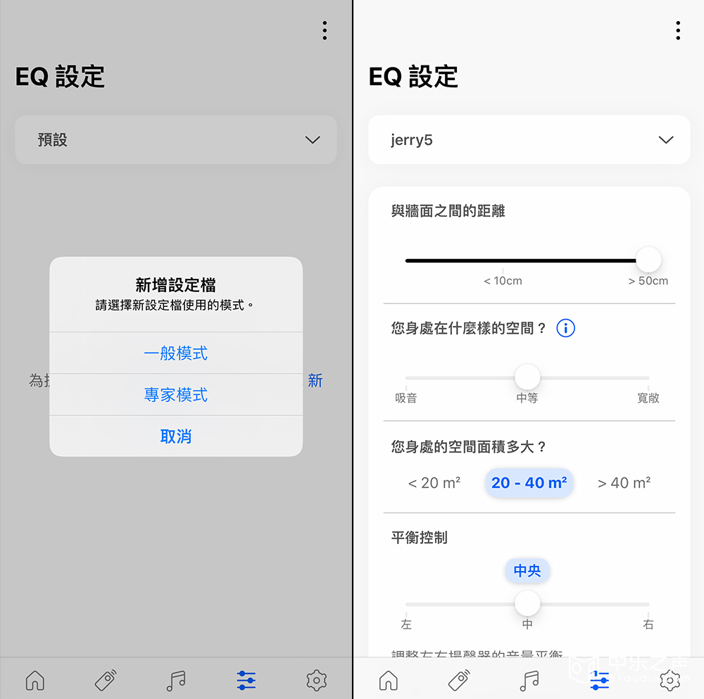 可是主观音色的部分,LS60 保留很大的空间让使用者定义,KEF Connect 的数字等化调整功能,并不是传统 Graphic EQ,依据频段设置,而是对使用者友善的直觉式设置,提供一般模式与专家模式两种方法设置。以一般模式设置,App 会问您的空间是吸音、中等或宽敞,并且有辅助文字定义空间,并询问聆听空间大小等等,设置选项简单又直觉。