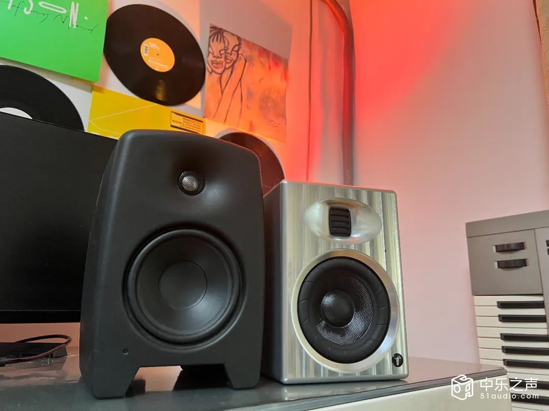 这款音箱呢就是把它摆成一个等边三角形去听,可以给它上一个支架或者在桌面上有一个较矮的支架,这样都是对声音有帮助,因为它低频的这种反射会少一些,适合近场去听,你离的五米开外肯定听的就没那么好。