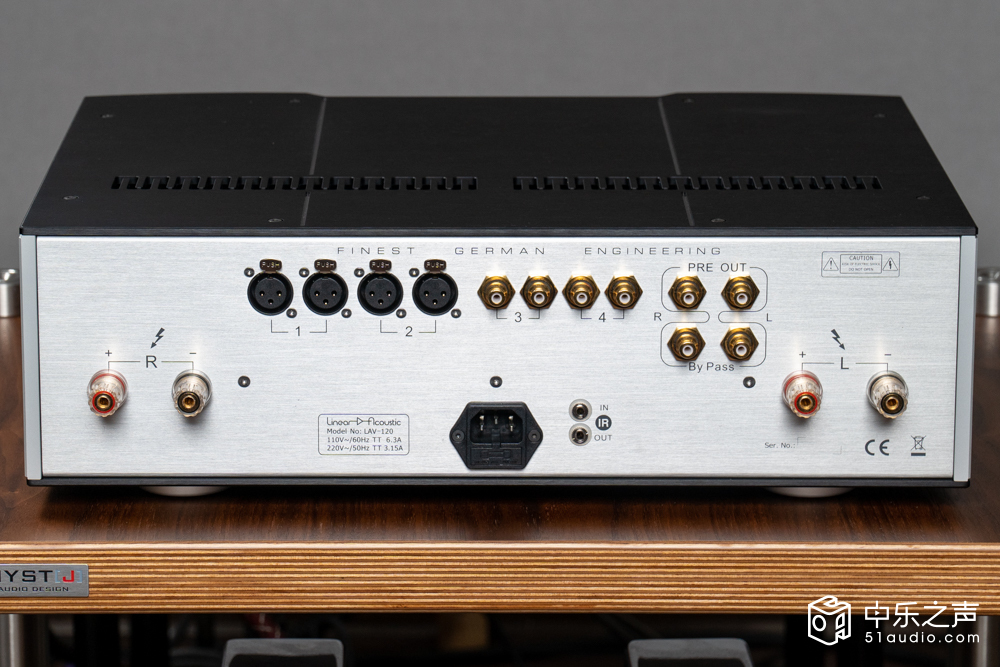 Linear Acoustic的功放有几个特点。首先,它们标榜所谓的黄金一瓦,也就是从第一瓦起就有低失真,并且能维持工作的线性。有多低呢?厂家给的数值是0.01%,而且是从第一瓦开始就能常态地维持如此低的失真。其次,它们虽然账面上的大输出功率值不太吓人,实际使用时却能感受到其推力充沛而且控制力好。LA-V 120的输出功率,对应8欧姆音箱高120W,对应4欧姆音箱则是近乎倍增的220W。
