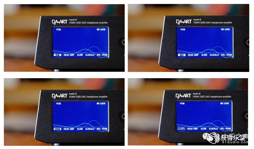 按下功能音量旋钮,IPS屏幕上的输入信号显示区域变成反色显示状态,此时旋动旋钮即可选择不同的信号输入通道。有USB、AES、同轴、光纤标识可以清晰辨别。