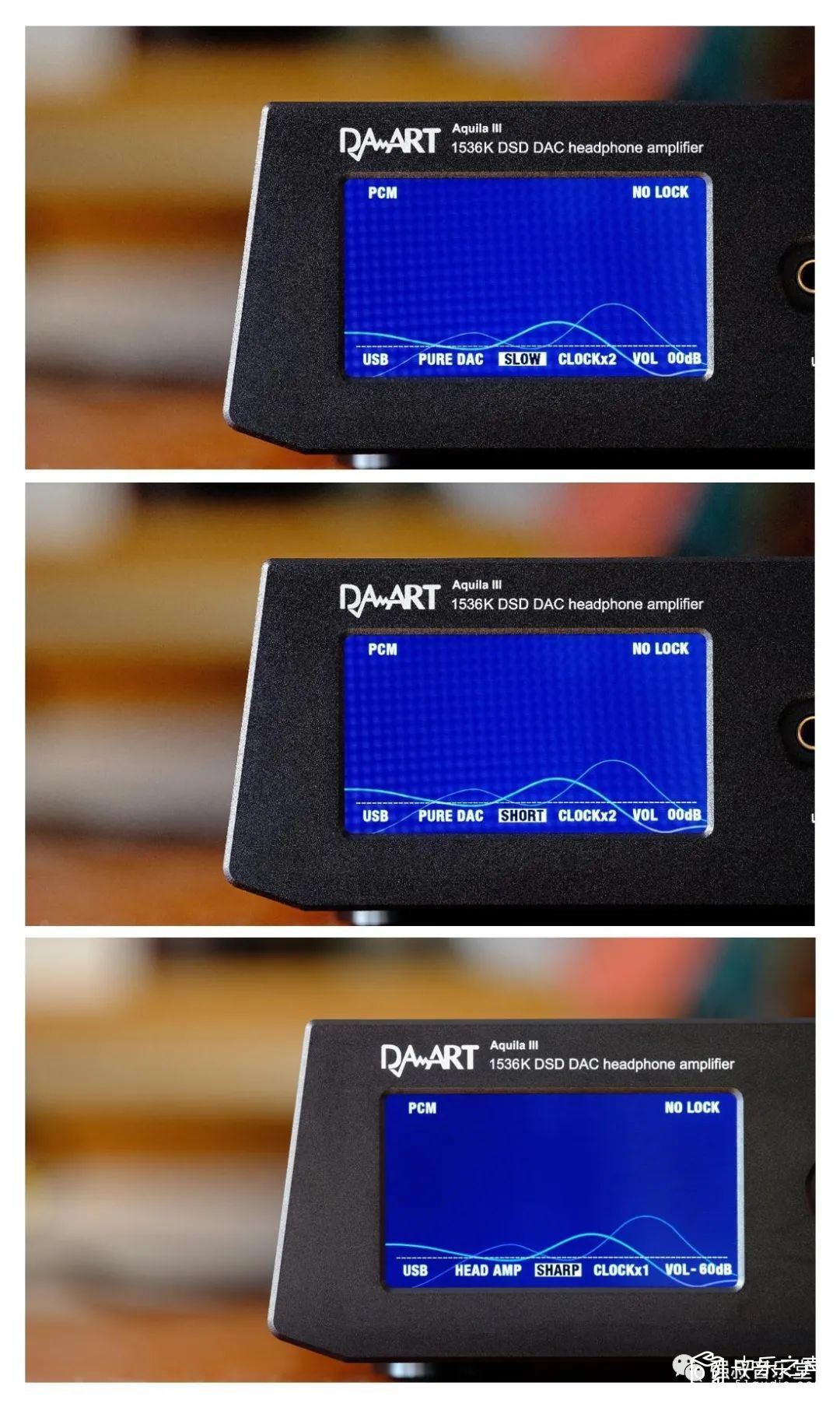 同样操作方法进行滤波器模式的调节,三种滤波器模式分别为SLOW、SHORT和SHARP。SLOW为缓降滤波器高频轻微衰减,适合聆听高频部分有较多毛刺感的音乐内容;SHORT为短延迟缓降滤波器,高频轻微衰减,适合聆听的是节奏比较明快的流行音乐内容;SHARP则是天鹰座三代官方推荐的默认设置,具备较为平直的频响吗,表现也比较全面,适合大多数的音乐内容。