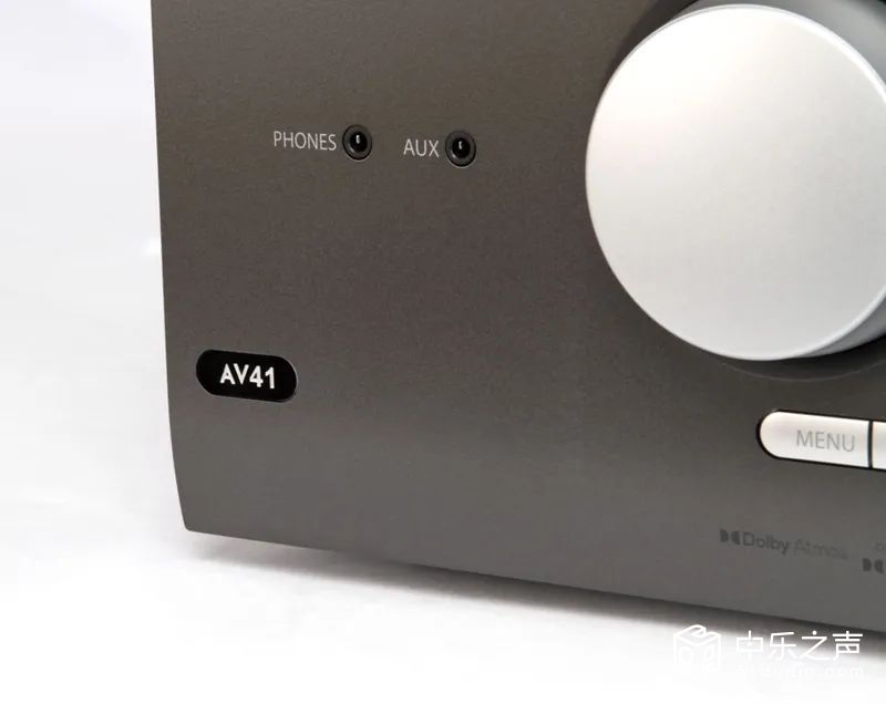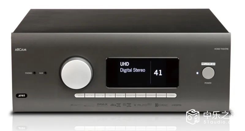 ARCAM AV41作为一款旗舰机型,整机的外形设计延续ARCAM低调务实的风格特点,选用坚固的金属机箱并经过焗油漆加工。面板上设计也已经配上所有功能按键和醒目的音量旋扭,所有操作都能直接上手。中间提供了一个大型的彩色屏幕,除了能显示当前的通道、格式、音量等信息之外,更能通过此屏幕进入详细的设置菜单,并不需要依靠HDMI连接投影或电视才能设置,此外还能显示播放音乐的专辑封面,实用程度非常高;屏幕下方是一排功能按键,能够进行一系列的设置和操作;左边设有一个大型组合旋钮、1个耳机接口以及1个AUX输入,方便用家接驳耳机、外置播放器等使用,为家庭影院体验提供令人惊叹的真实感。