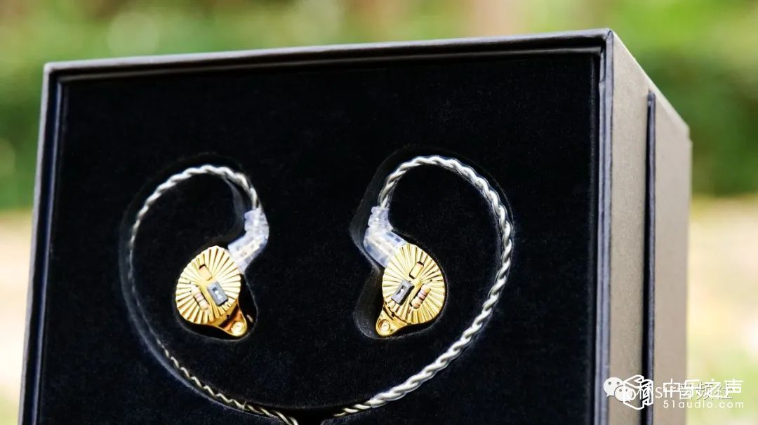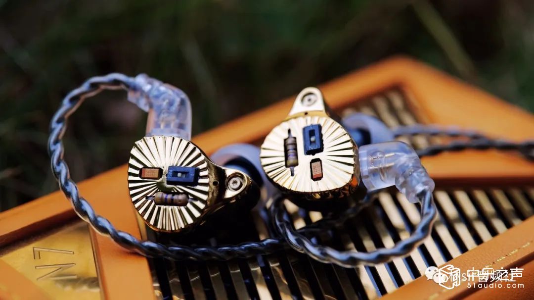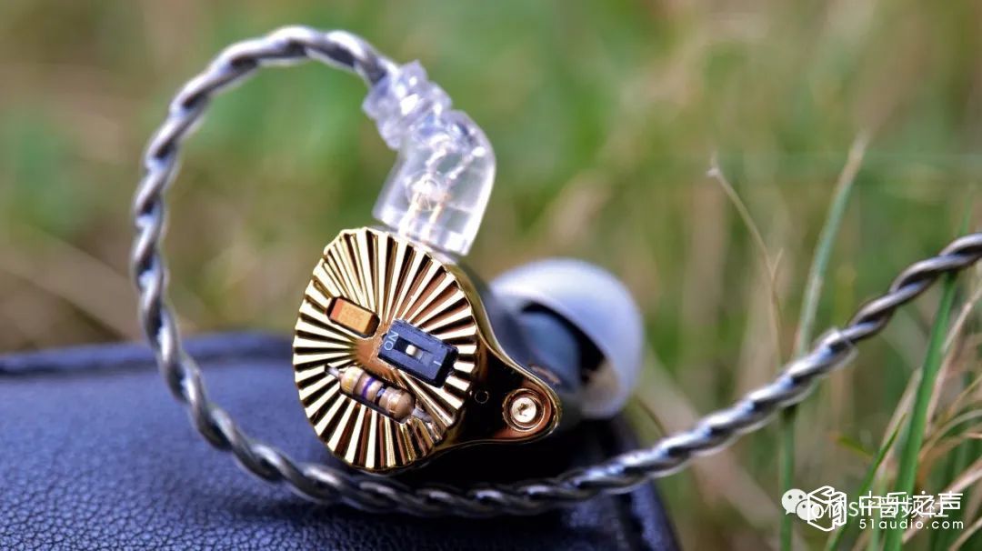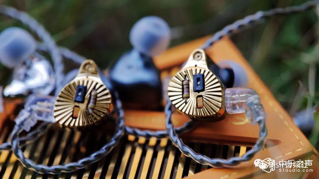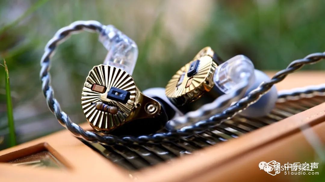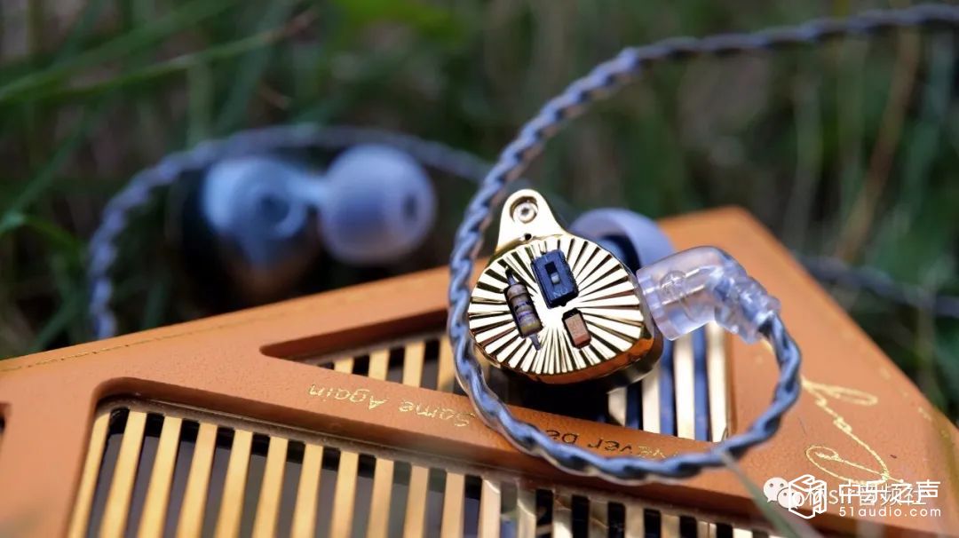 耳塞本体的外观绝对值得大书特书,金色腔体上有着向四周发散的射线状沟槽,而面板正中则放置着露出式的电阻电容和开关拨片,让人一眼望去想起埃及法老的面具,又带有些上世纪八十年代的复古风潮,甚至会略略想起劳力士的LOGO。说实话这么个设计如果有人画在图纸上给我看我会很担心实物能不能做出效果,因为这玩意儿但凡颜色和精细度有那么一点不对劲可能拿到手上都会觉得有问题。好在TFZ还真不虚这个,航空级合金铝材CNC高精壳体制作,工艺雕得非常漂亮,出来的实物再如何仔细端详都很NICE,在不同光线下会闪烁不同的亮度,加之手感优秀,十分耐盘。后腔体分为两种配色,后腔工艺就更是不用担心了——总之成品的TFZ CROWN是一副辨识度十足的,相当精致漂亮,且分量不重,佩戴感优异舒适的小玩意儿,这塞子啊,绝对是拉风的,绝对挣够回头率。