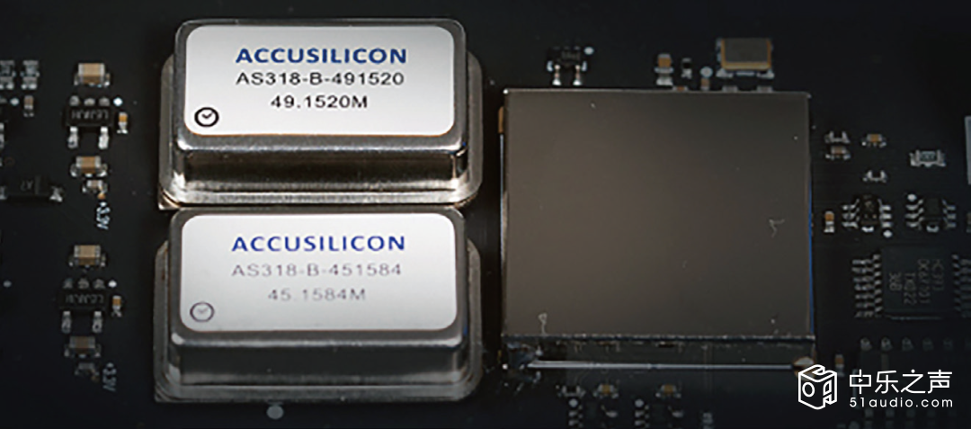 ⑤刚拿到第一台装好的D2R样机的时候,我首先注意到的不是芯片也不是电源,而是主板上两颗晶晶亮的双时钟晶振。这是Accusilicon公司的AS318-B晶振,频率分别是45158.4KHz和49152.0KHz,对应的是44.1kHz和48kHz的整数倍。这两颗时钟芯片是目前桌面音频界的“网红”,标称参数不错,外观唬人,价格也比同档次的TCXO(温度控制晶振)贵很多。这表明D2R在时钟上没有省钱。