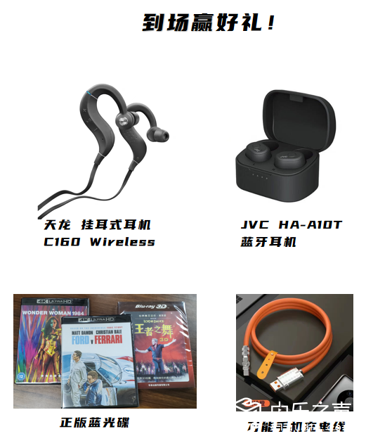 现场还为大家准备了超多好礼:天龙挂耳式耳机、JVC蓝牙耳机、正版蓝光碟片、手机充电线等。