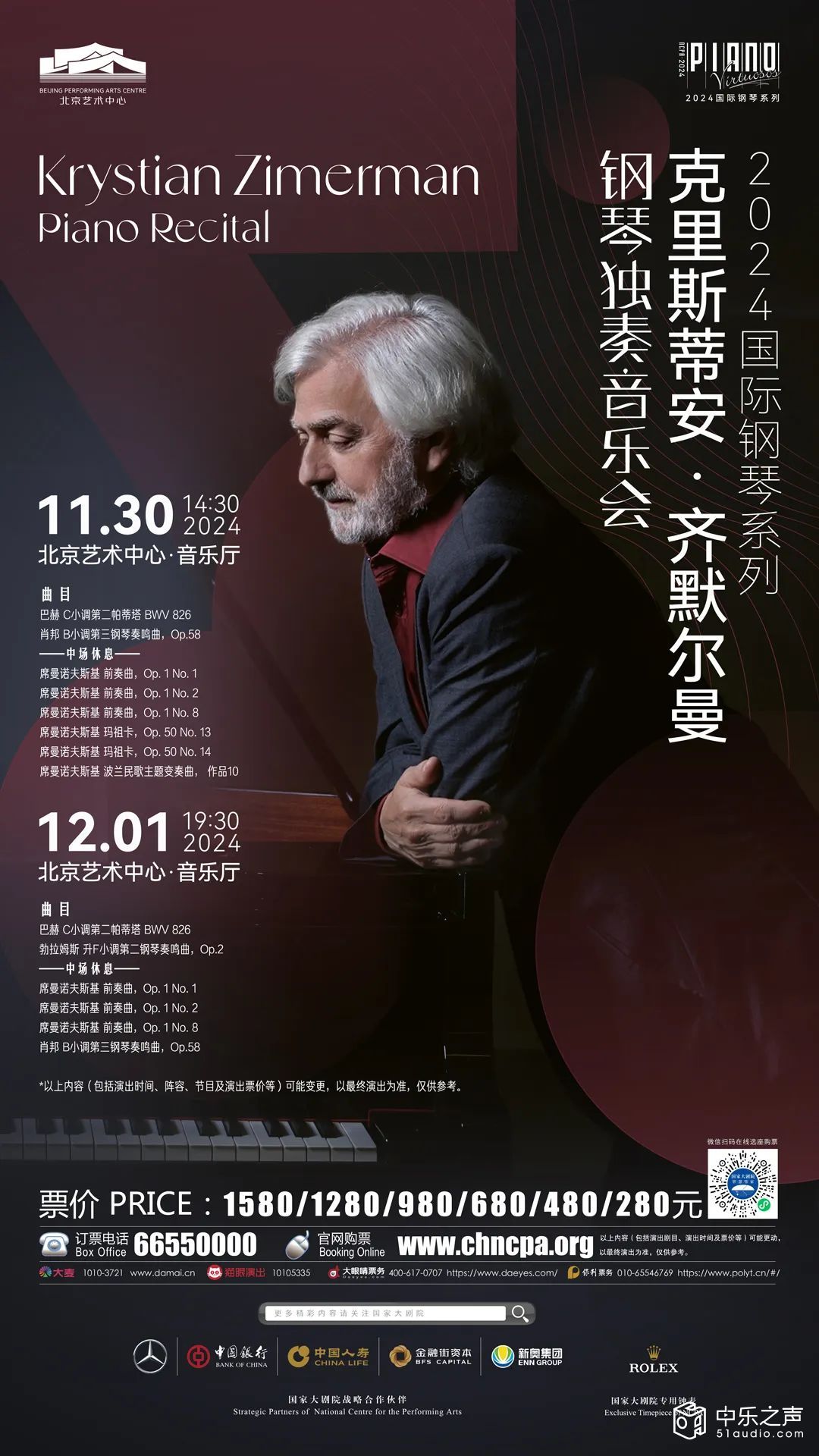 今年年初,齐叔首次登台国家大剧院,给予中国乐迷刻骨铭心的音乐记忆。感动于北京观众的热情,齐叔将再度现身这座艺术之都,亮相北京艺术中心,慷慨奉献两场精品演出。11月30日至12月1日,中国观众将再度领略到这位传奇大师的精妙乐音,肖邦《第三钢琴奏鸣曲》、席曼诺夫斯基《波兰民歌主题变奏曲》、巴赫《第二帕蒂塔》、勃拉姆斯《第二钢琴奏鸣曲》等古典名篇,都将在齐叔指下再现无与伦比神韵。
