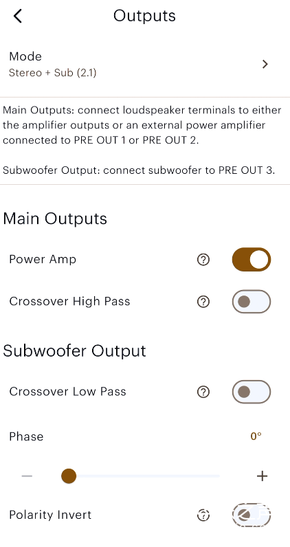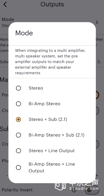 在MaestroUnite App里面用户可以根据自己的设备情况,轻易地设定立体声、双功放立体声、立体声+炮2.1系统、双功放+炮2.1立体声系统、立体声+前级输出等预设模式,十分人性化的设计。