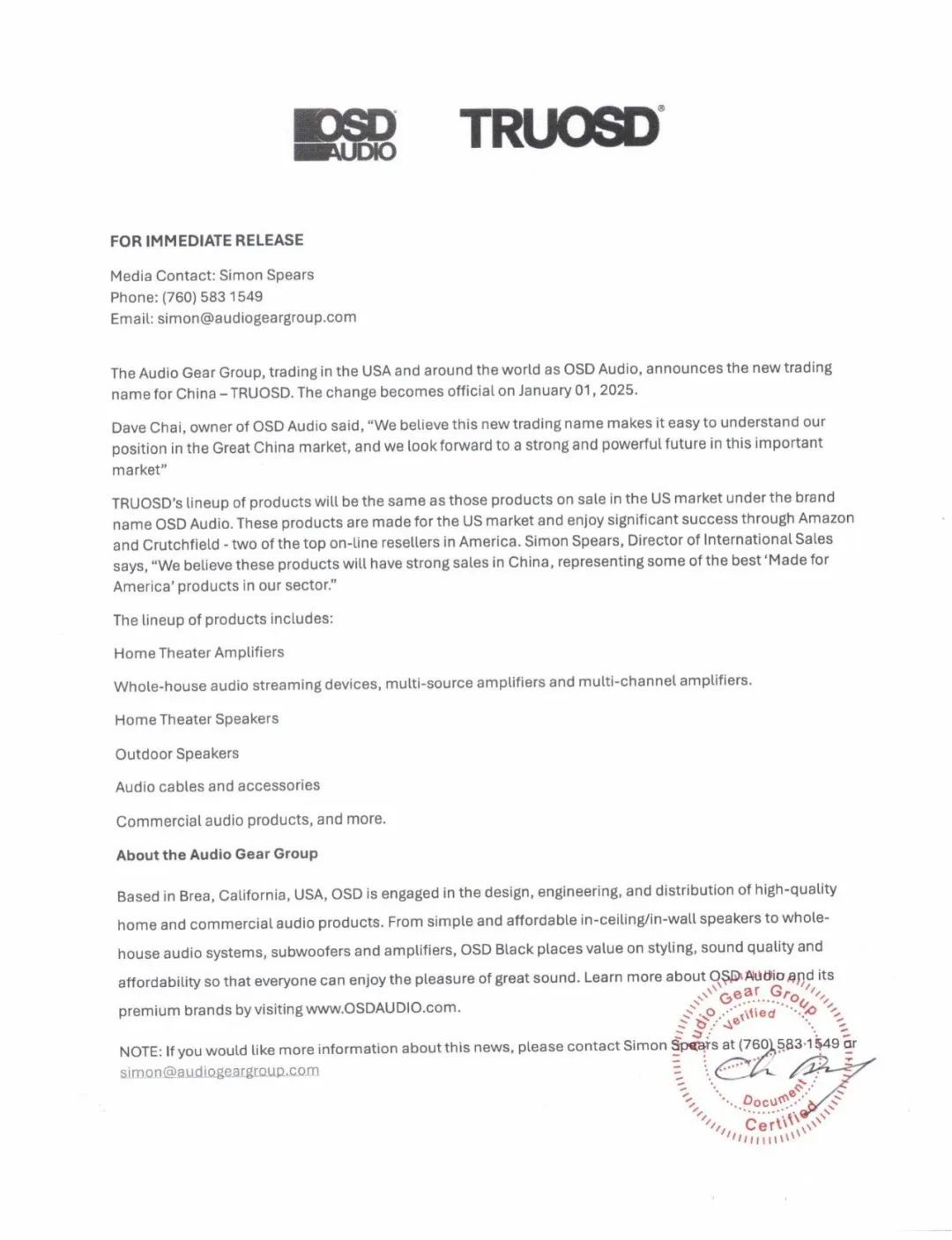 多年来,美国OSD Audio 凭借优异的产品品质和卓越的用户体验,在中国市场拥有了良好的口碑。全新品牌 TRUOSD 将继续传承这一优势,为中国消费者提供全球同步的高品质音响产品。