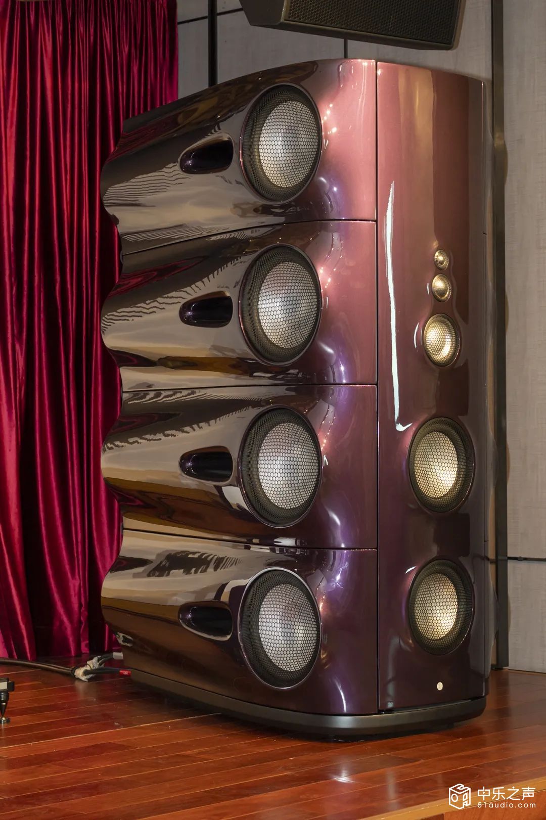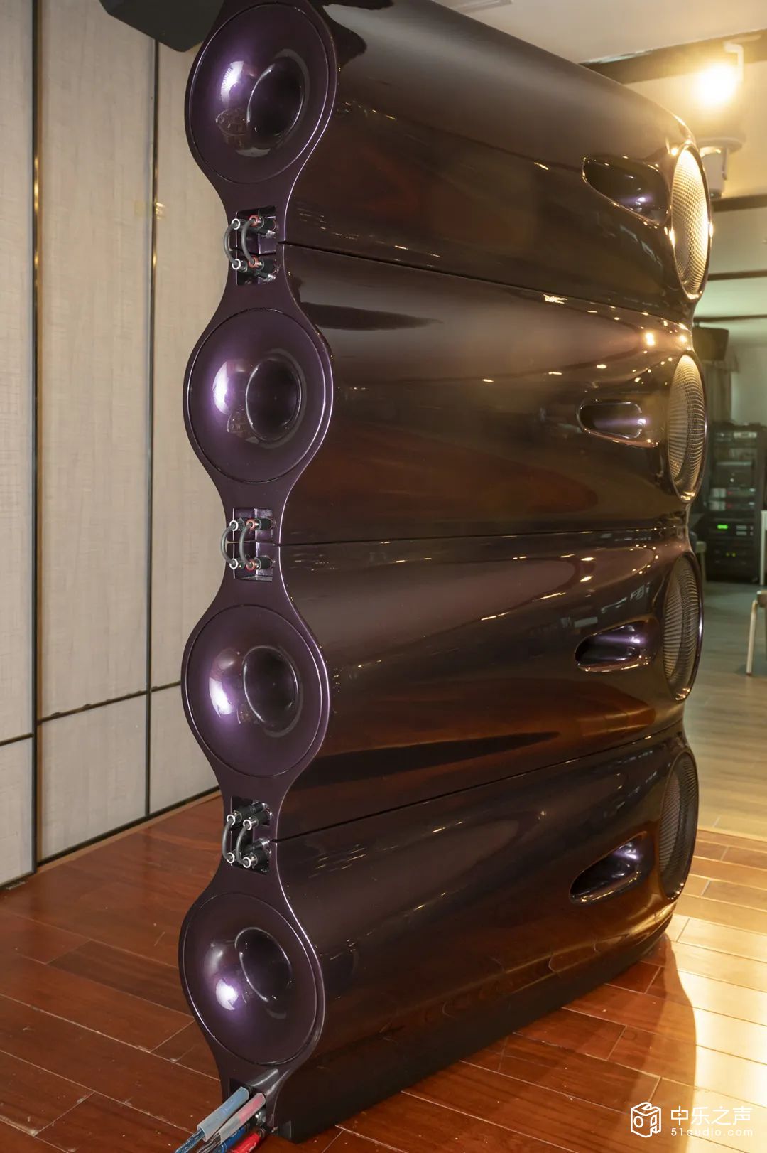 Moya M1是一对五分频13单元的“巨无霸”,每只音箱包括一只26mm高音、一只50mm中高音、一只100mm中音、2只175mm中低音以及8只225mm低音单元(口径只算到橡胶边内,实际上是11英寸单元),低音可下潜至20Hz以下。