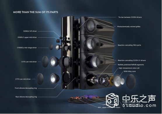 为了能再生绝对的低频,M1采用了8颗传奇经典的C225-100H低音单元,每个单元具有100mm直径的音圈,可提供高功率承受力需要的足够大面积的线圈,并且降低喇叭当音圈脱离磁路时产生明显失真以及线圈温度提升所带来的效率以及音质劣化。凭借45mm磁间隙行程多产生了3db声压,Moya M1通过使用 8个低音单元将单个驱动器的振膜偏移行程减小到原来的1/8,这意味着它们只以微小的震动却能获得巨大的听觉冲击。