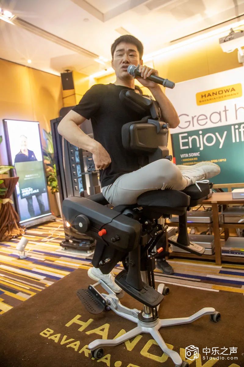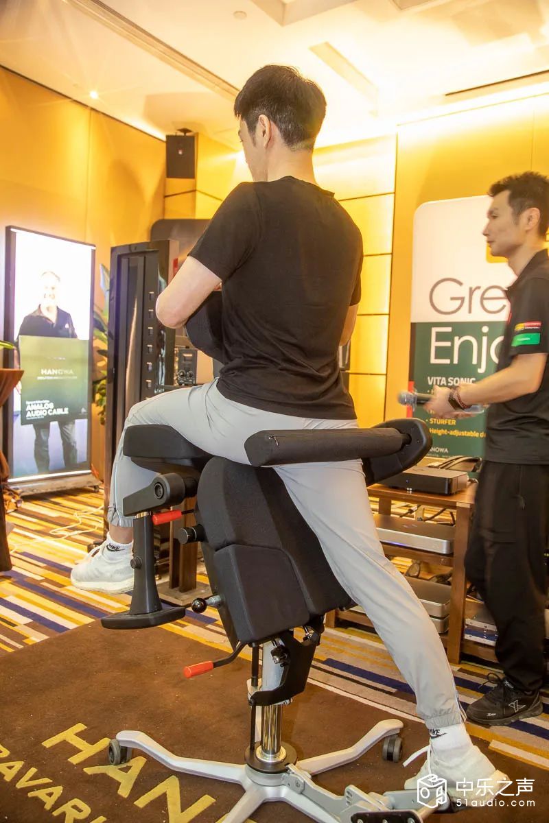 此外,VITA SONIC 健康工作站 的发布则引发了与会嘉宾的广泛关注。该系统结合了HANOWA M5音响系统与STURFER医疗科技的冲浪椅技术,通过声学解压疗愈与物理训练的结合,为使用者提供了一种全新的身心协同体验。高质量的声音与舒适的物理训练同步进行,帮助用户在身心放松中恢复健康。