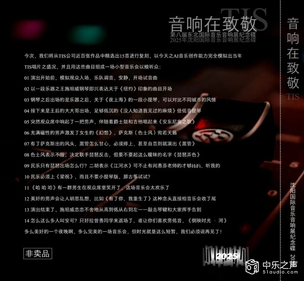 今次,我们将从TIS公司近百张作品中精选出15首进行复刻,以今天之AI音乐创作能力完全模拟出当年TIS唱片之盛况,并且用这些曲目组成一场小型音乐会。