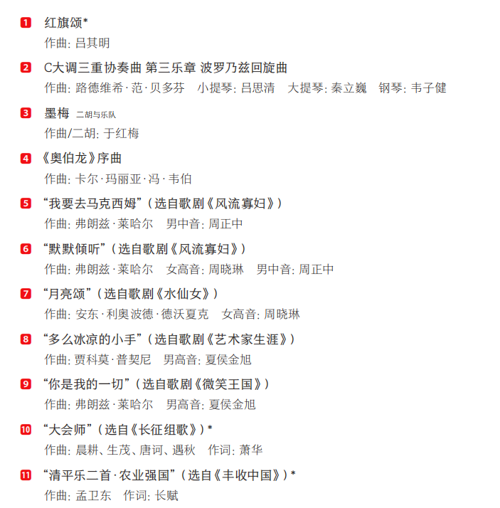 音乐会还呈现了诸多经典歌剧选段,包括韦伯创作的《奥伯龙》序曲,国家大剧院制作雷哈尔轻歌剧《风流寡妇》中的选段“我要去马克西姆”与“默默倾听”,德沃夏克创作的《水仙女》歌剧选段“月亮颂”,普契尼创作的《艺术家生涯》歌剧选段“多么冰凉的小手”,以及雷哈尔创作的《微笑国王》轻歌剧选段“你是我的一切”。