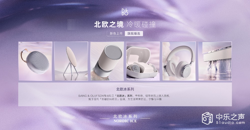 来自丹麦的 Bang & Olufsen(B&O)日前推出了全新 Nordic Ice 北欧冰系列颜色产品,包含 Beoplay EQ 真无线耳机、Beoplay H95 无线耳罩式耳机、Beosound A1 第二代蓝牙音箱、Beoplay A9 第四代蓝牙音箱、Beosound Stage 杜比全景声 Soundbar、Beosound Balance 无线蓝牙音箱,该系列皆采用浪漫的紫丁香与银色铝材完美相互映衬,打造经典设计。